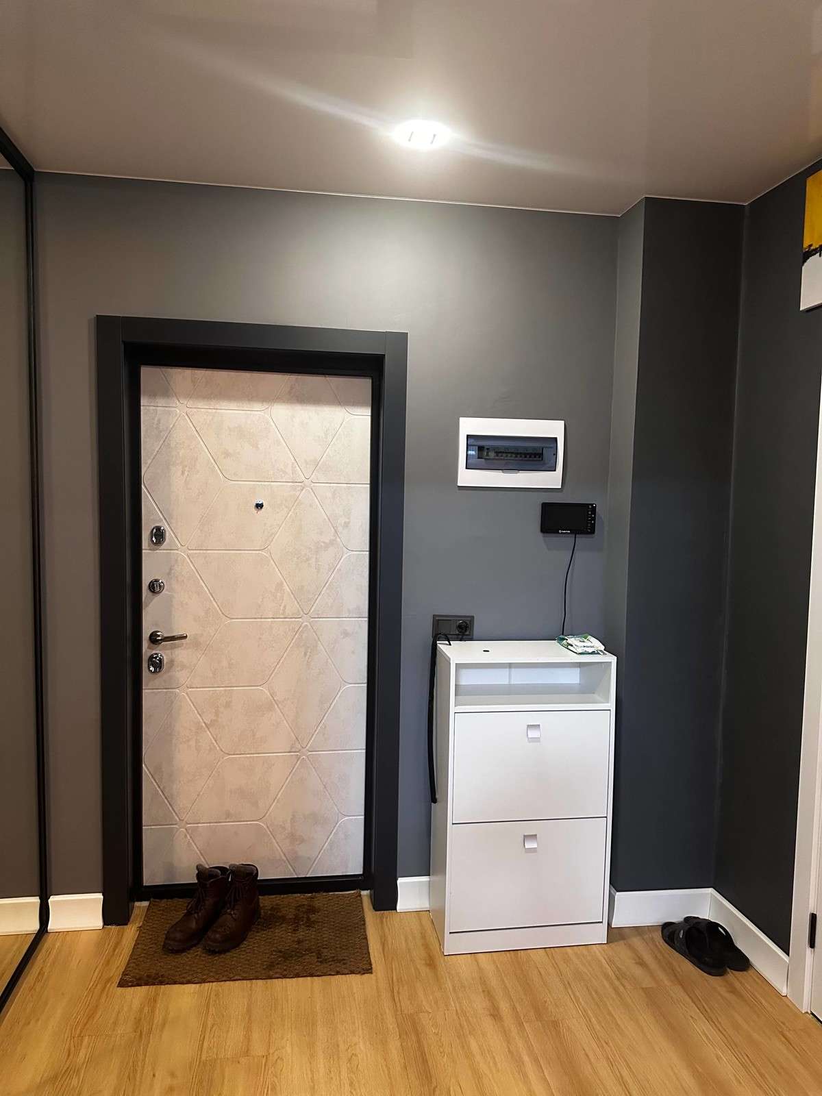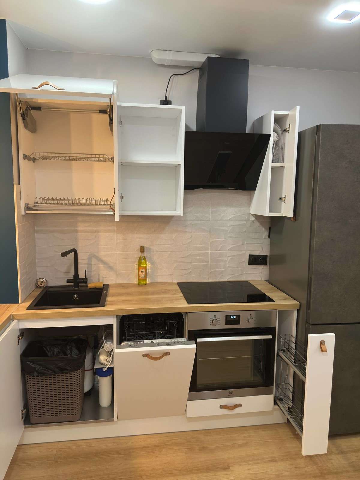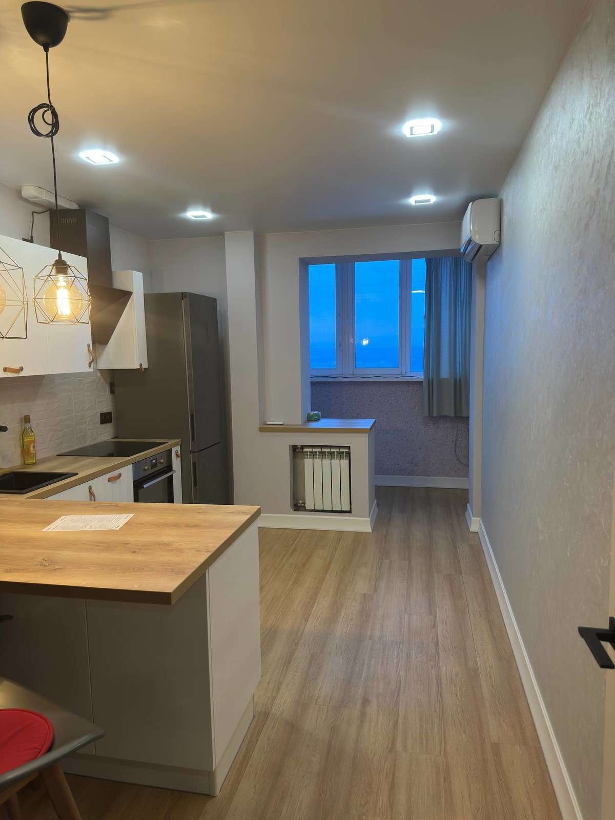 B квартире плаcтиковые окна, натяжные потолки со встроенными светильниками, на полу кварц винил, на стенах обои под покраску, окрашены качественной краской фирмы "Тиккурила" можно смело мыть, санузел полностью отделан плиткой. Качественная мебель и техника, на кухне кондиционер. Вся мебель и техника: встроенная кухня, холодильник , духовой шкаф, электрическая плита, посудомойка, стиральная машина, диван встроенные шкафы, электрический камин в спальне, все остается. Квартира не требует вложения, ремонт в отличном состоянии.