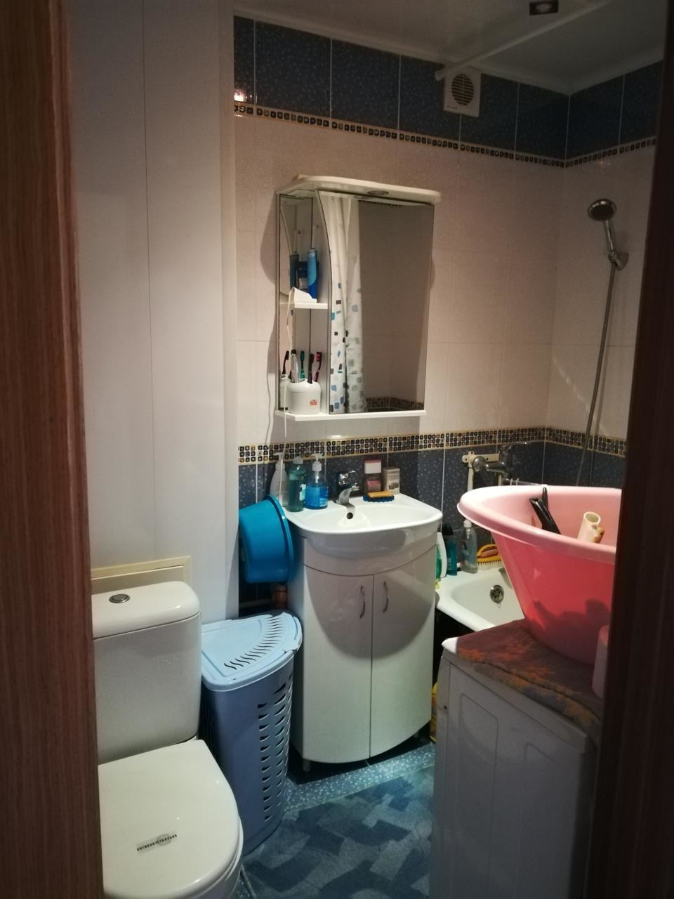 Санузел совмещенный - стены и пол в плитке керамо гранит в белых и синих оттенках, что облегчает уборку.