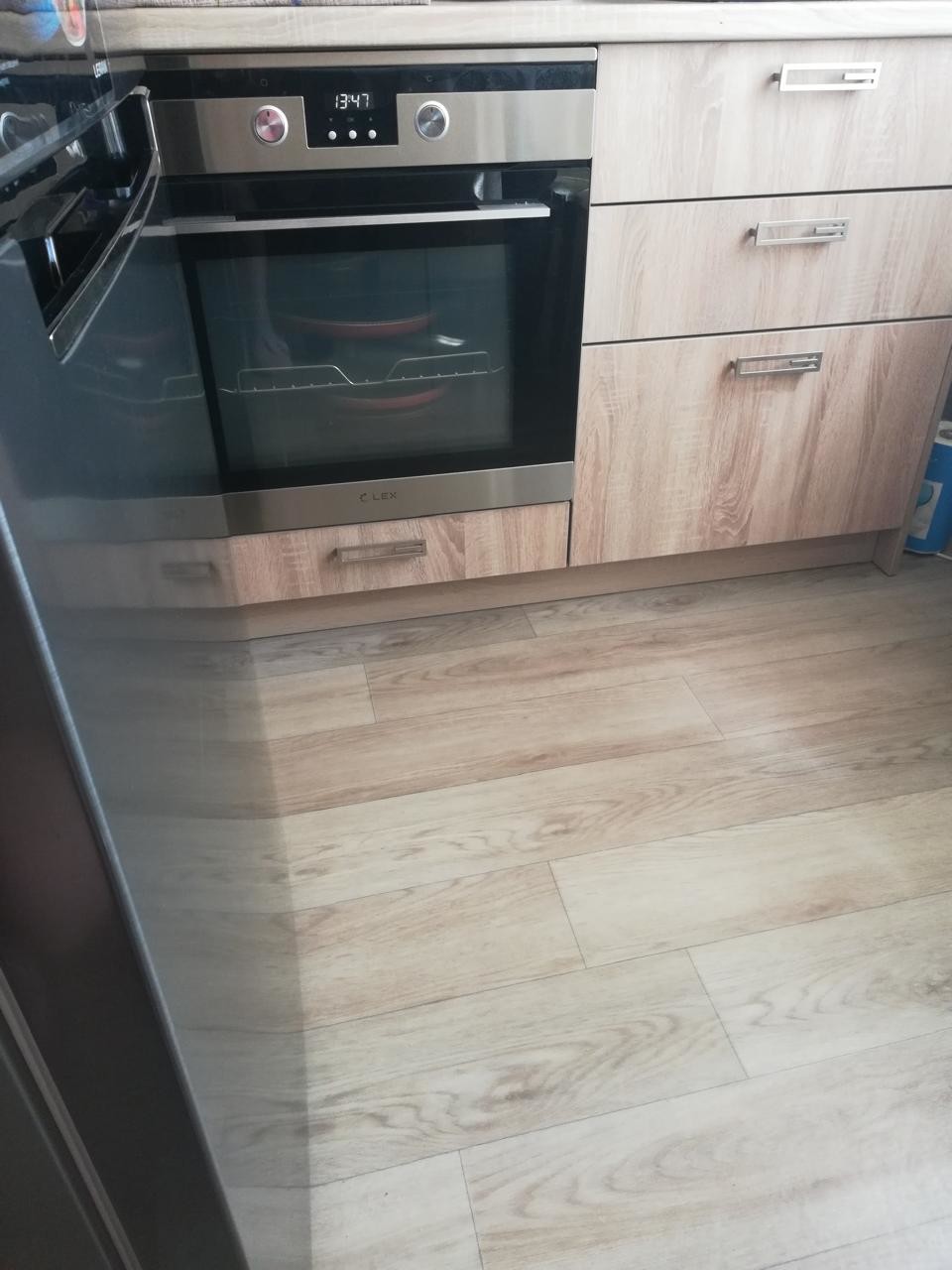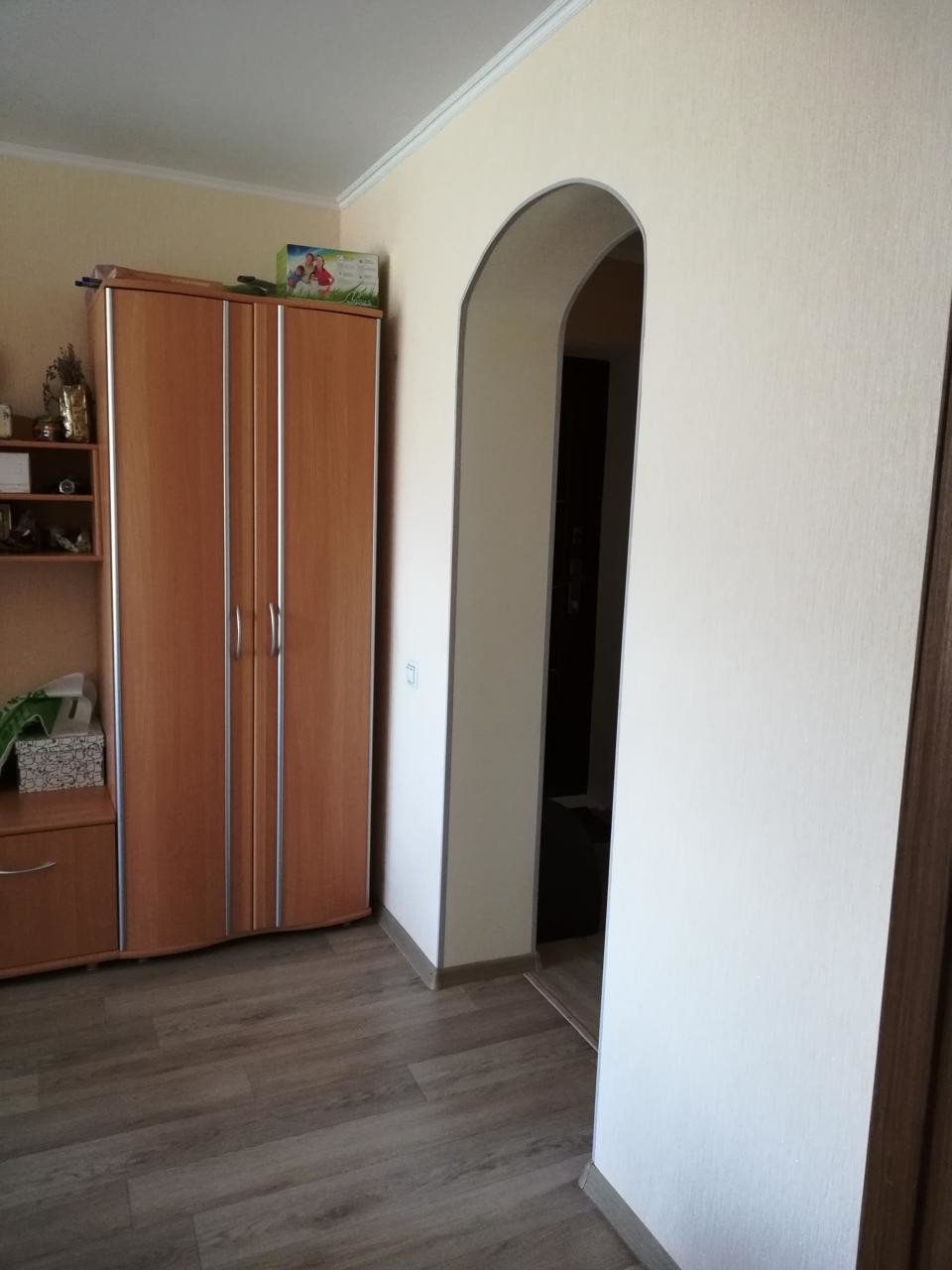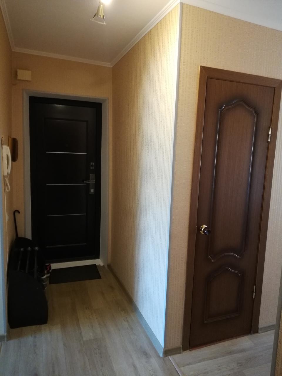 Приятны бонусом к покупке остается современный кухонный гарнитур в светло-коричневых тонах. Новая входная дверь приятно гармонирует с ремонтом в квартире.