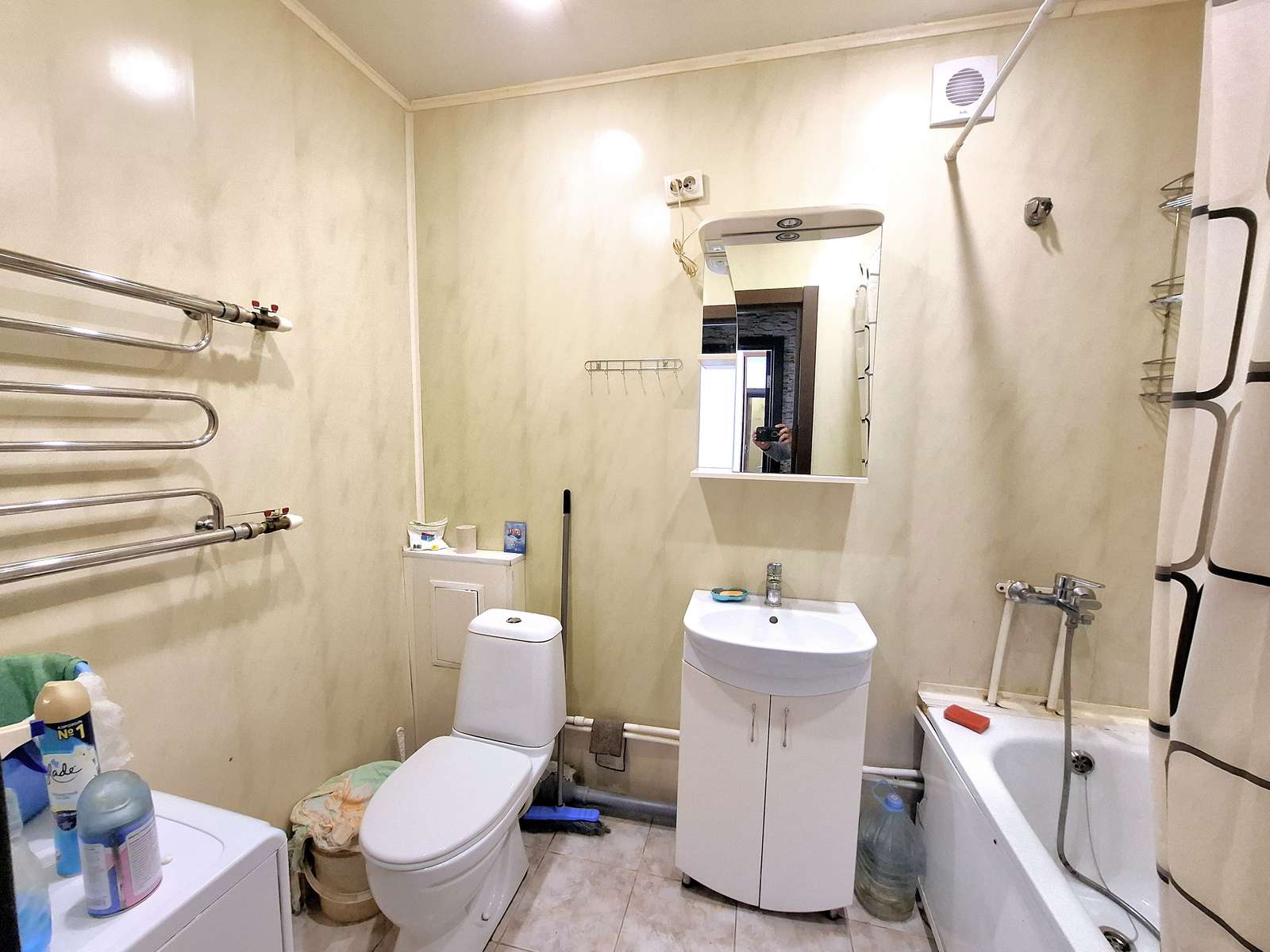 · Совмещённый санузел в светлых тонах, есть стиральная машина ?.