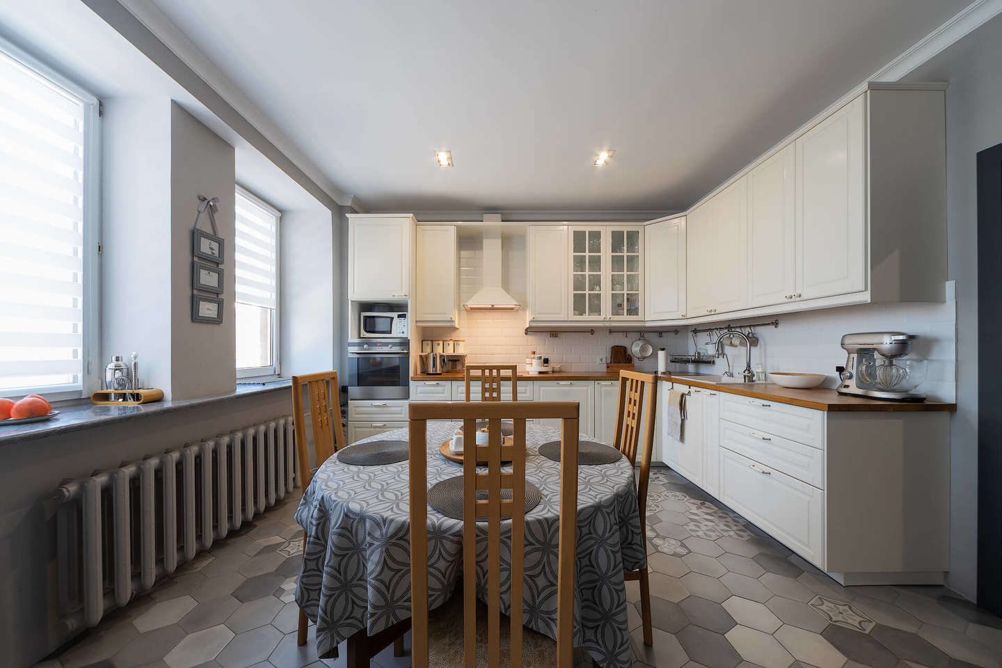 - ? Просторная кухня площадью 22 квадратных метра станет местом семейных ужинов и дружеских встреч.
