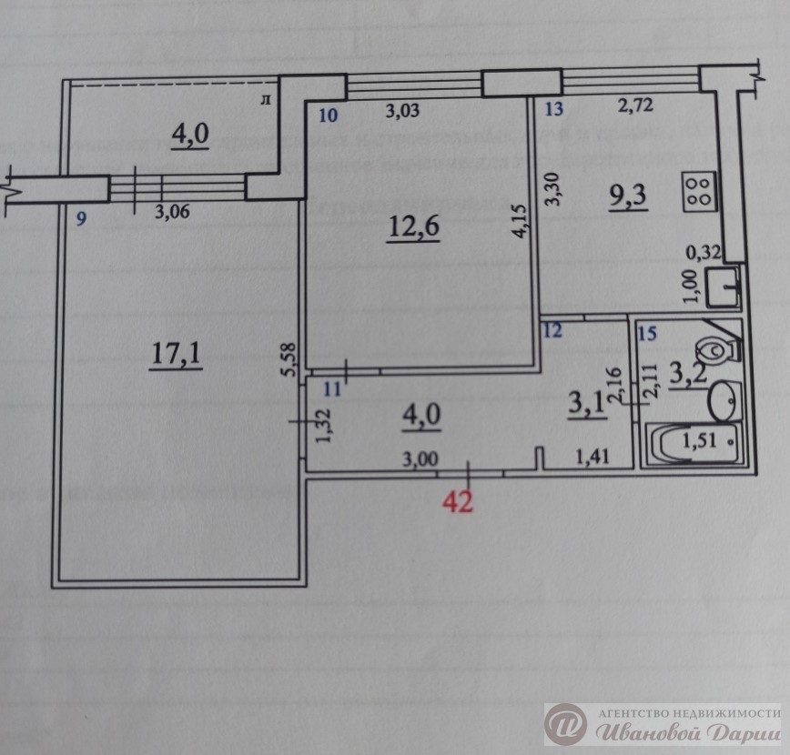 2х комн. кв. общ. площ. 49,3 кв.м, жилая 29,7 кв.м (17,1+12,6), кухня 9,3 кв.м,