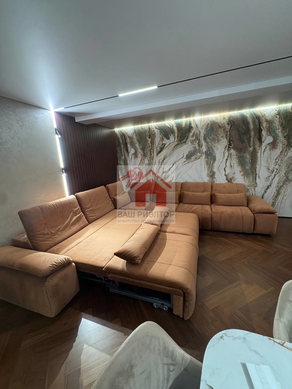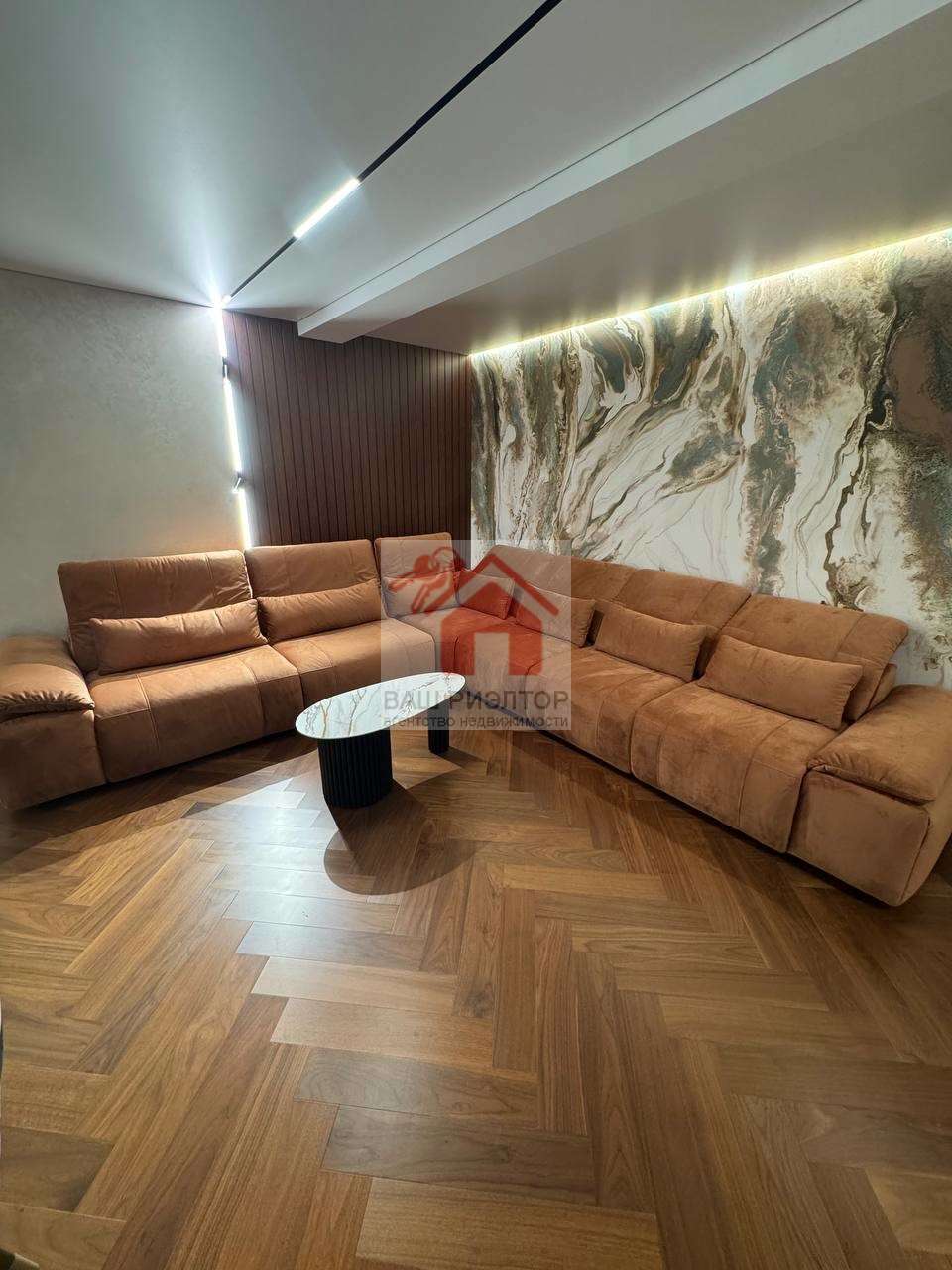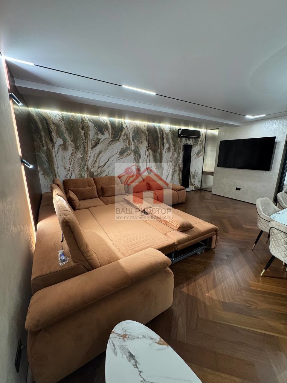 Для удобного расположения в гостиной имеется удобный функциональный автоматизированный диван EVANTY, сплит система CENTEK., телевизор диагональю 85.