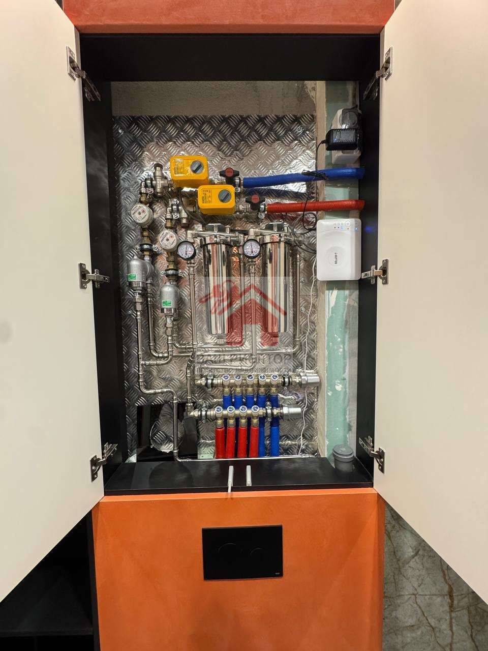 В проекте использовался только итальянский керамогранит, краски производства Бельгия, декоративная штукатурка ARTICA SIGNORIA, немецкая сантехника GROCENBERG, гигиенический унитаз с подсветкой и подогревом - автоматически смывает и омывает унитаз, в ванных комнатах установленный тёплый пол, который также подключаются к Wi-Fi системе, стиральная машинка на 7 кг плюс сушильная машинка, над ней шкаф с выдвижной системы для сушки и хранения белья, все отопительные приборы оснащены терморегуляторами. В квартире установлены приборы учёта индивидуального употребления на отопление