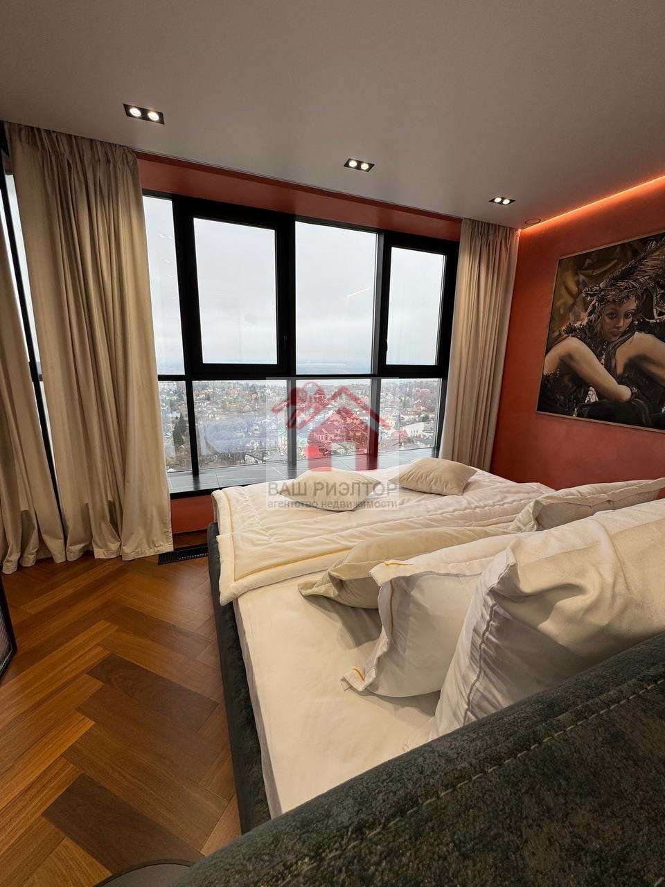 Мастер-спальня с трехпакетными панорамными окнами TTC и видами на Волгу никого не оставит равнодушным. Удобная двуспальная кровать Casaricca Италия ортопедическим матрасом и постельным бельем TOGAS, установлены датчики движения для удобства прохождения в ванную комнату и обратно. Картина, расположенная в спальне, является оригиналом известный художницы Турции.