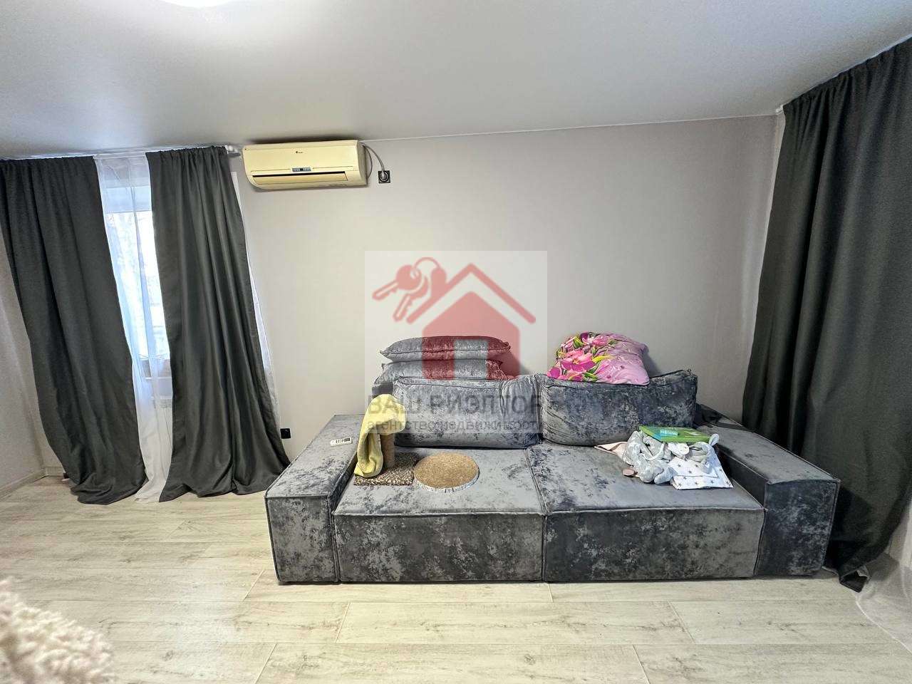В квартире остаётся кухонный гарнитур, стол, техника, шкафы, кровать, кондиционер.