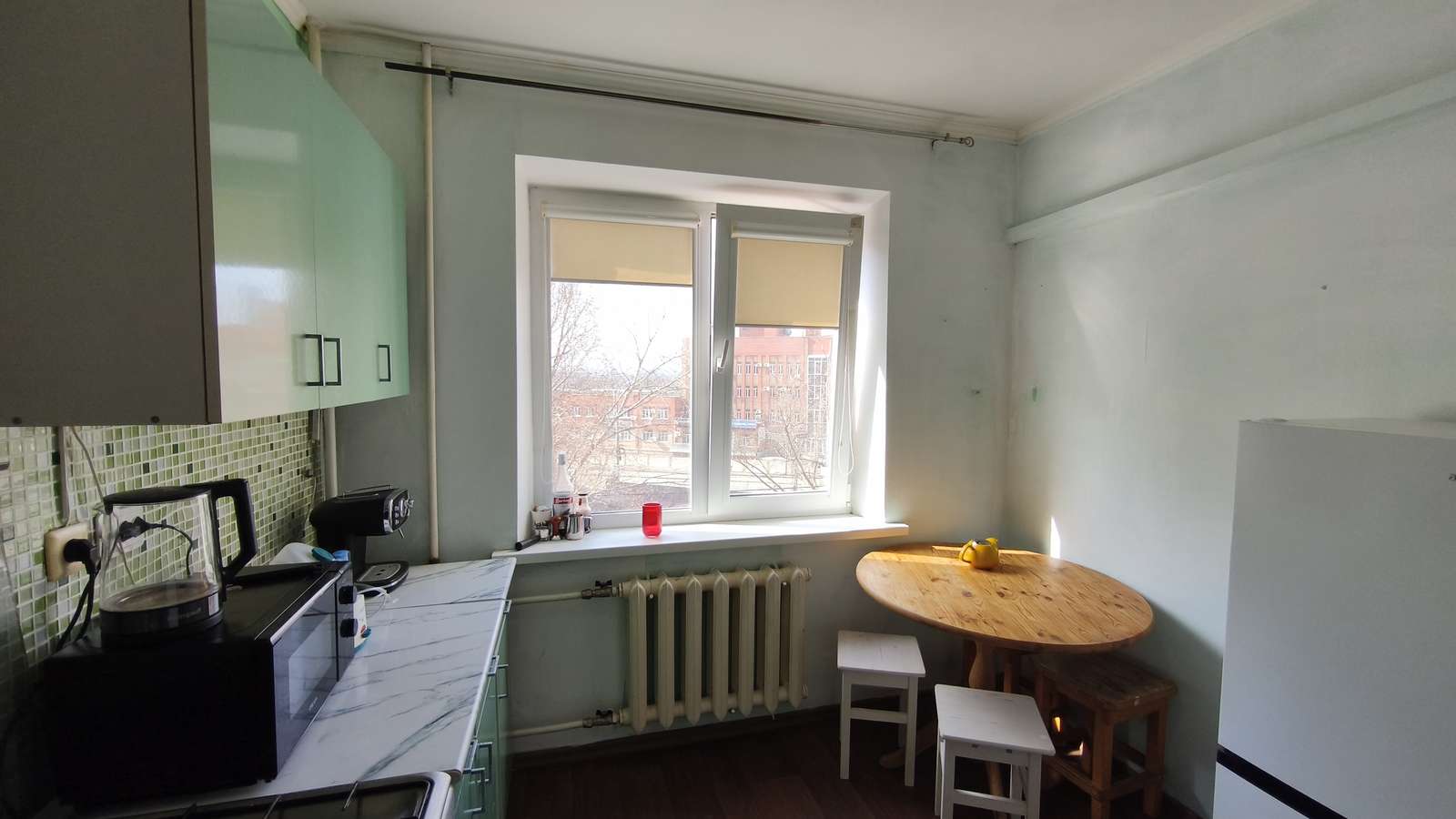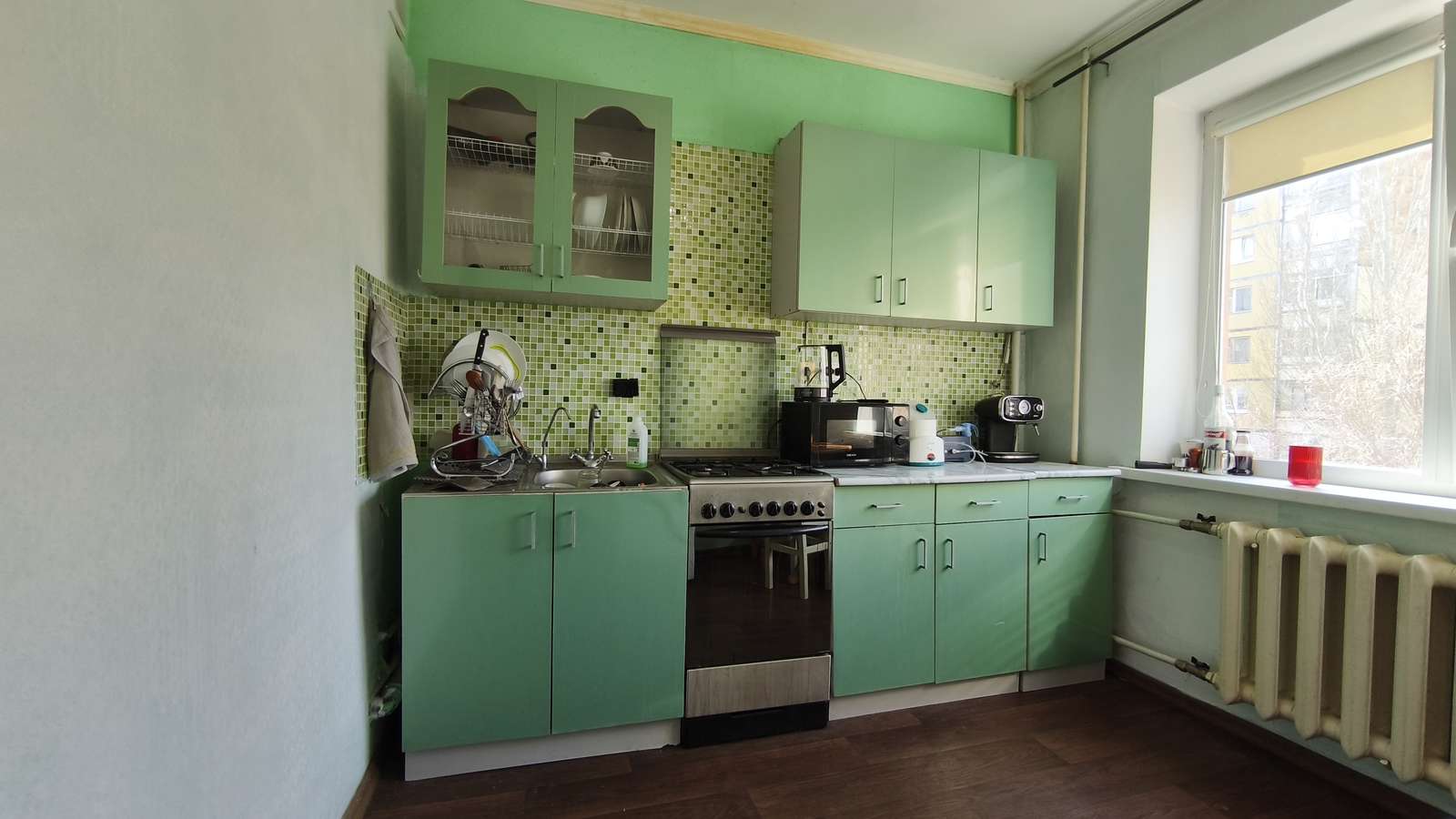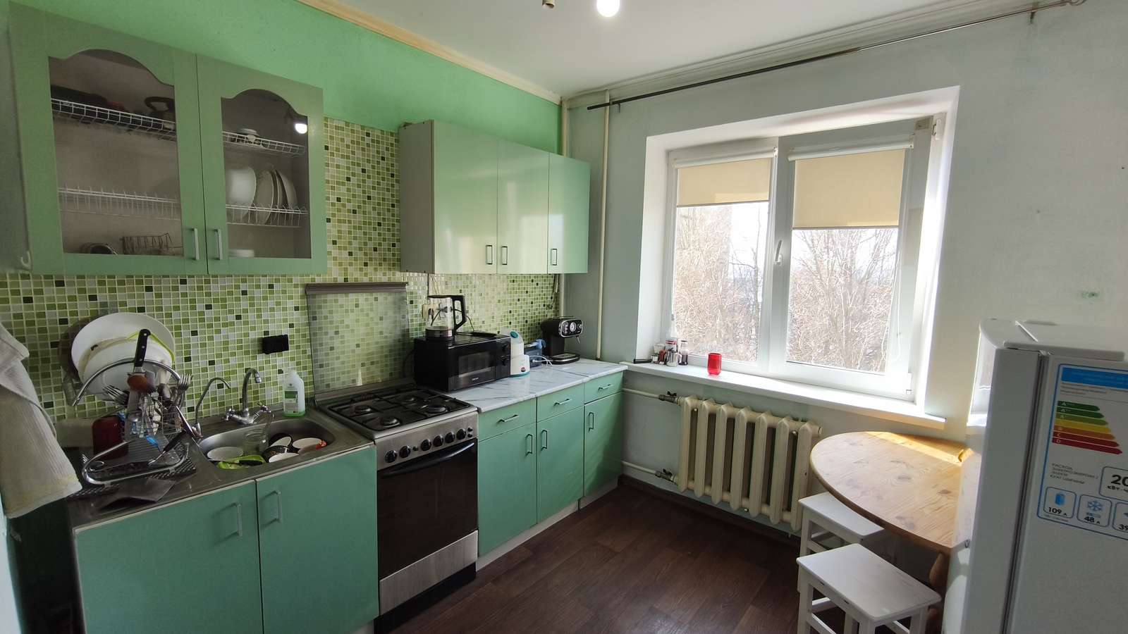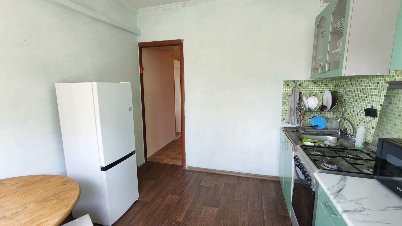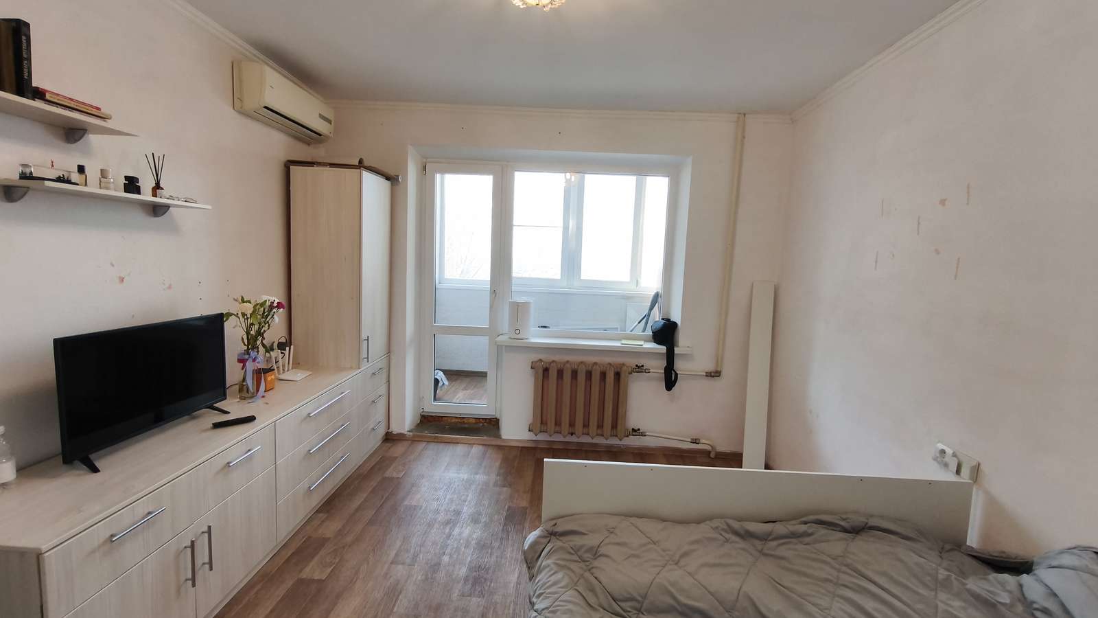 При продаже нашим покупателям оставим кухонный гарнитур, холодильник, шкафы, кровать.