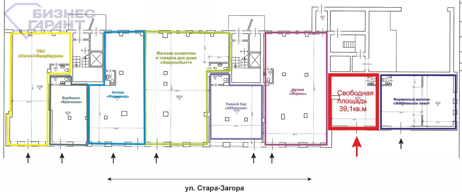 Удачное местоположение по ул. Стара-Загора, район пересечения с ул. Георгия Димитрова, огромный пешеходный и автомобильный трафик, отличная транспортная доступность. Рядом остановки общественного транспорта. Большая парковка перед галереей. В соседях все арендаторы - федеральные сети.