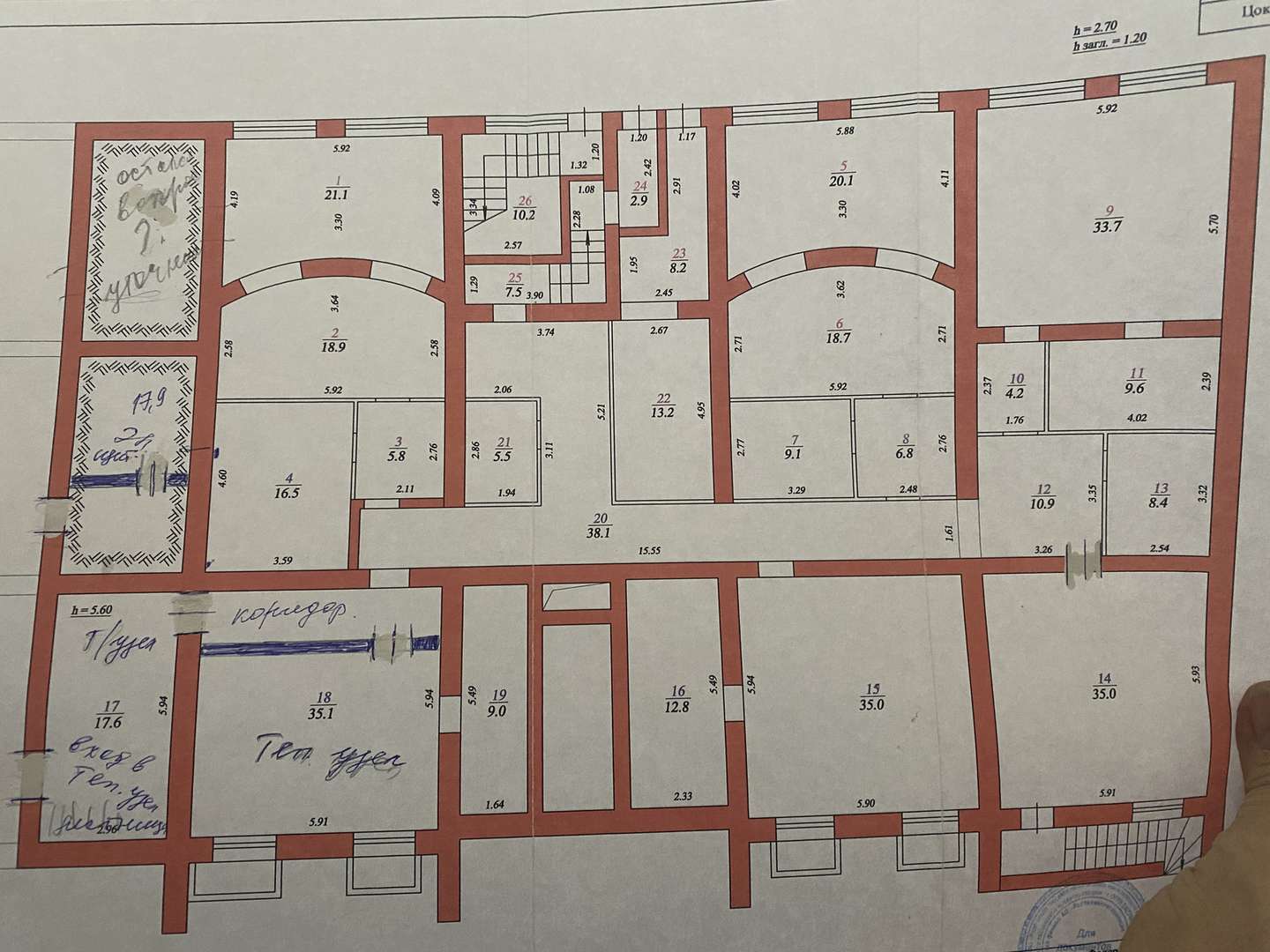 Отдельный вход, цокольный этаж, 5 кабинетов, в некоторых требуется ремонт, высота потолков 2,7 м.