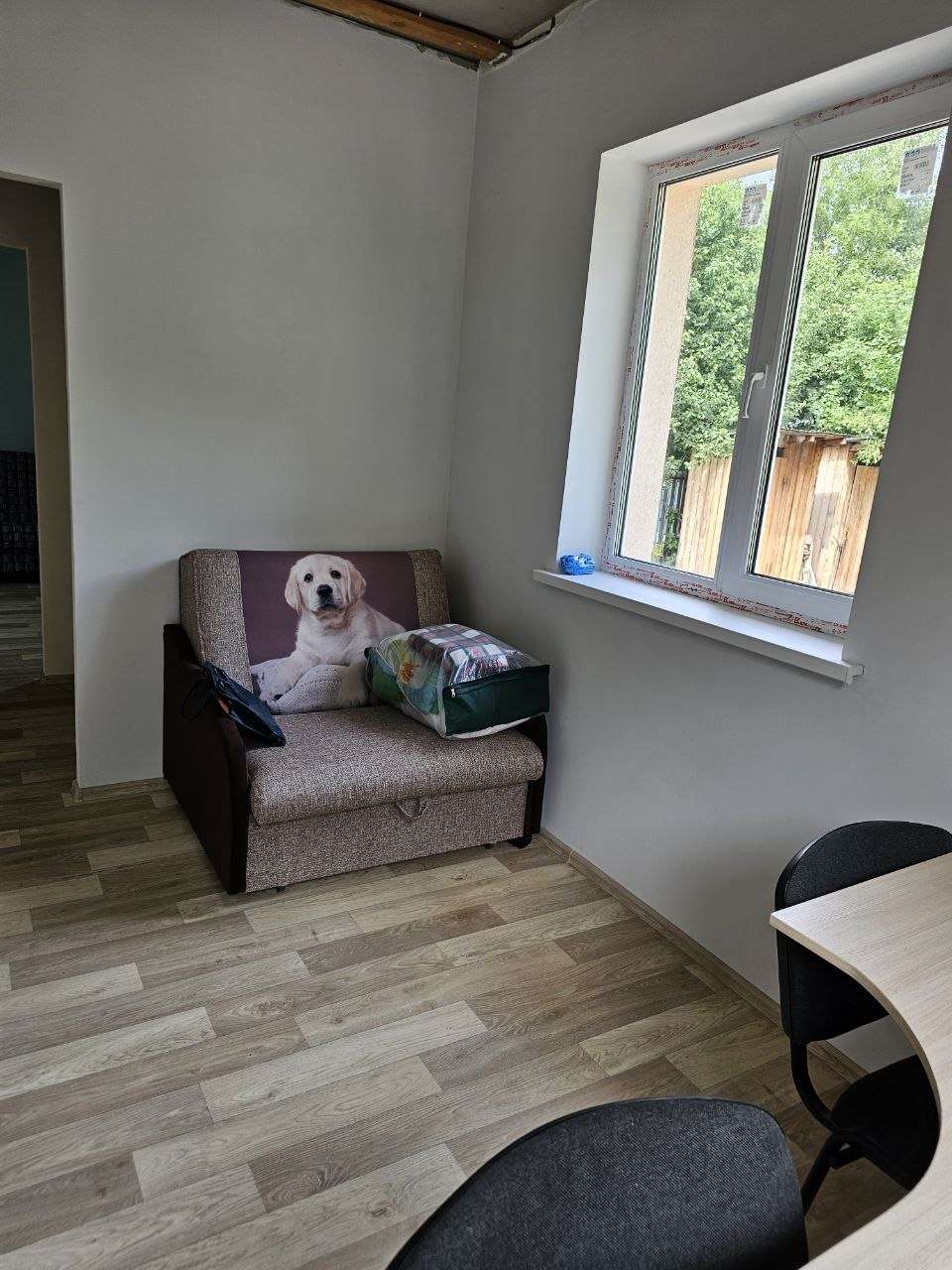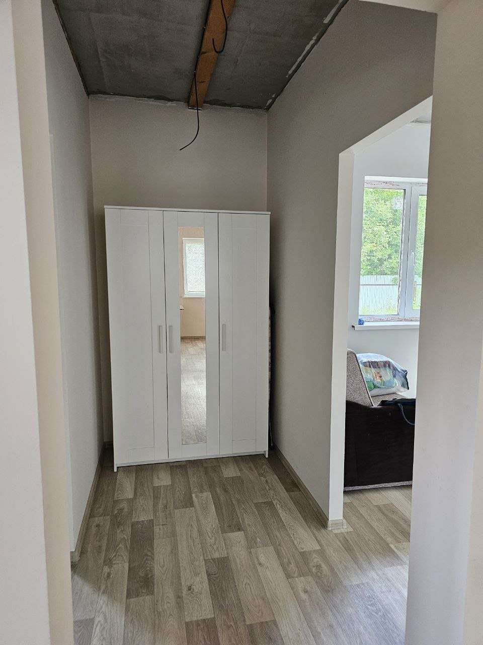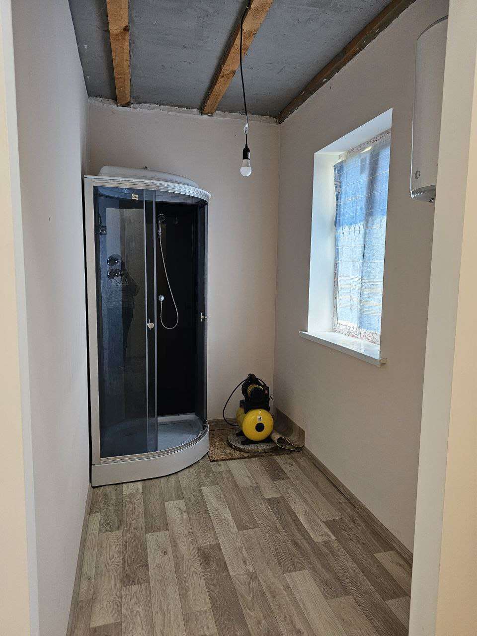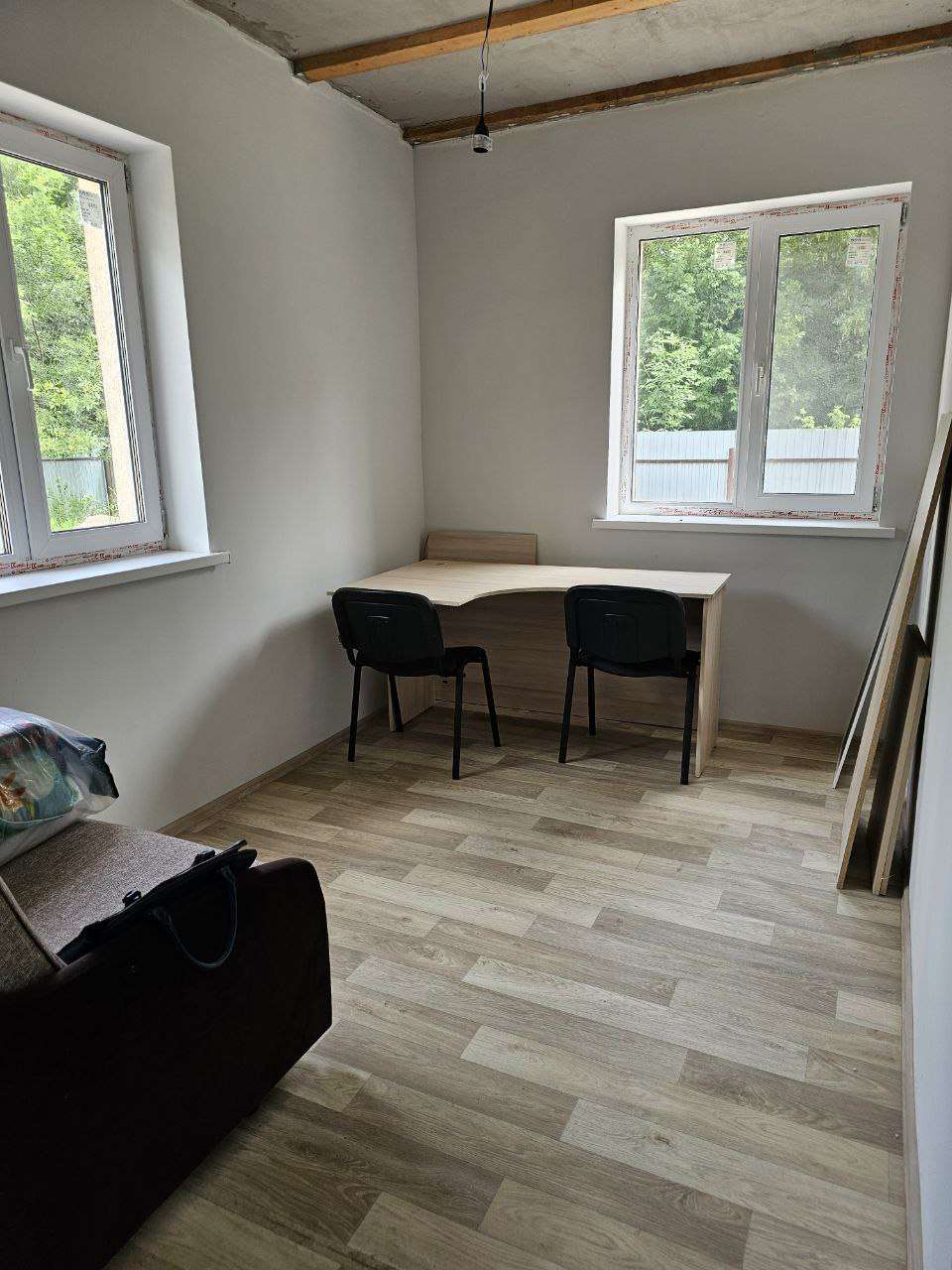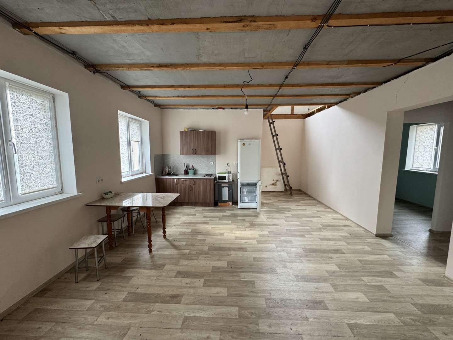 Первый этаж большая кухня-гостиная, две спальни и санузел.