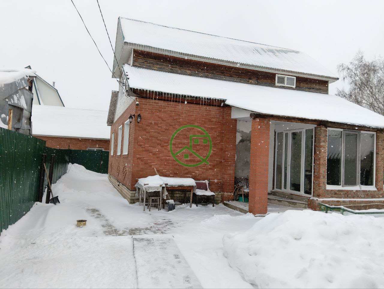 Дом обложен кирпичом, металлическая профилированная кровля. Веранда застеклена панорамными окнами оформлена декоративной плиткой.