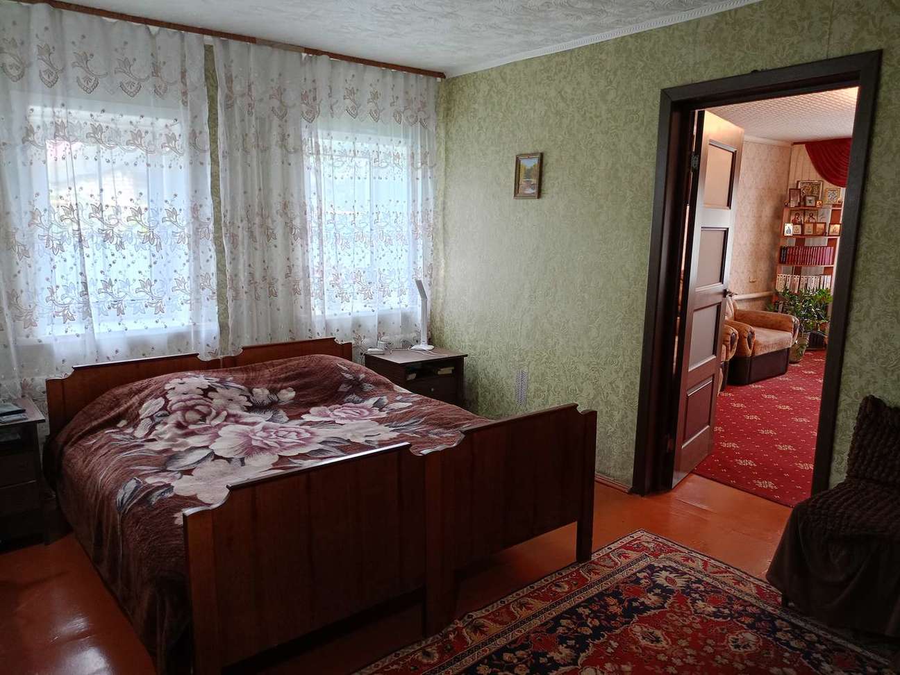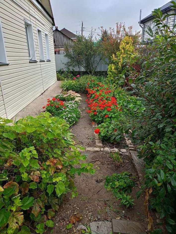 Земля ухоженная, много плодовых насаждений, цветов, остается теплица. Во дворе есть хоз постройки: гараж, сарай с глубоким погребом, кладовка, летний туалет и душ.