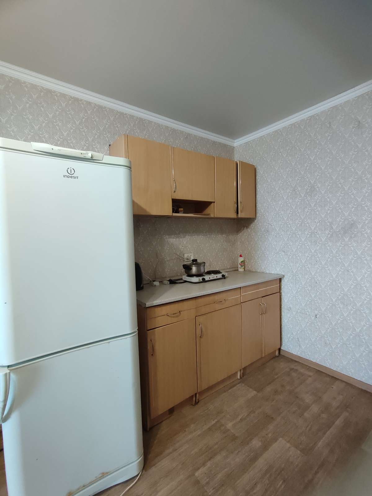 Окно пластиковое, полы линолеум, кухонная зона в правом ближнем углу, есть электрическая плитка двухкомфорчатая.