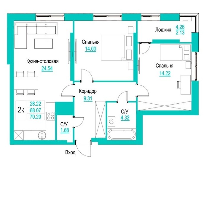 | Площадь, м² | 70/28/24 |