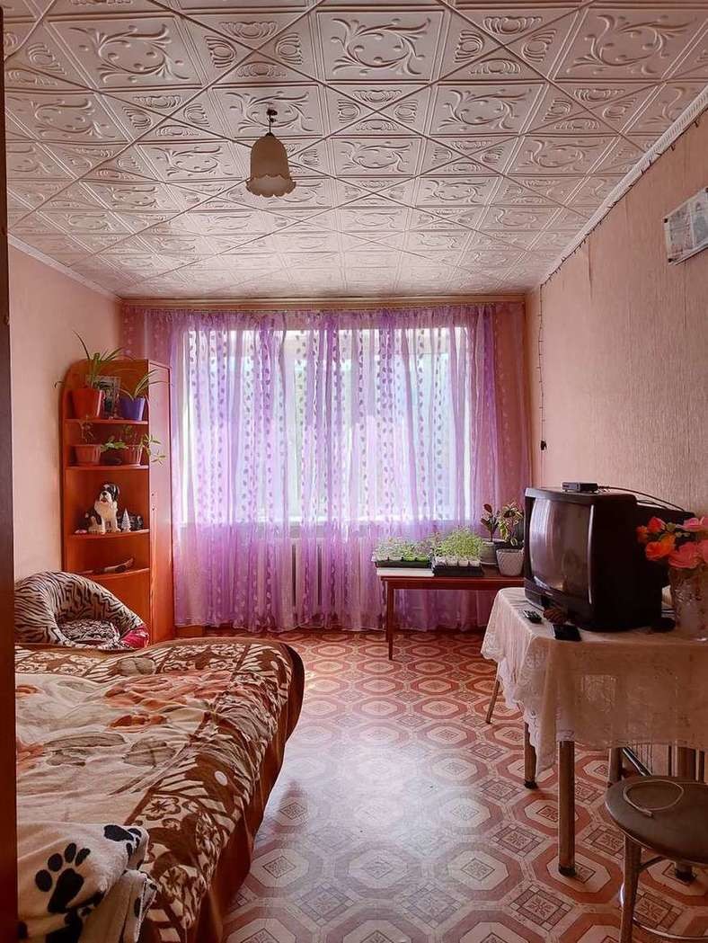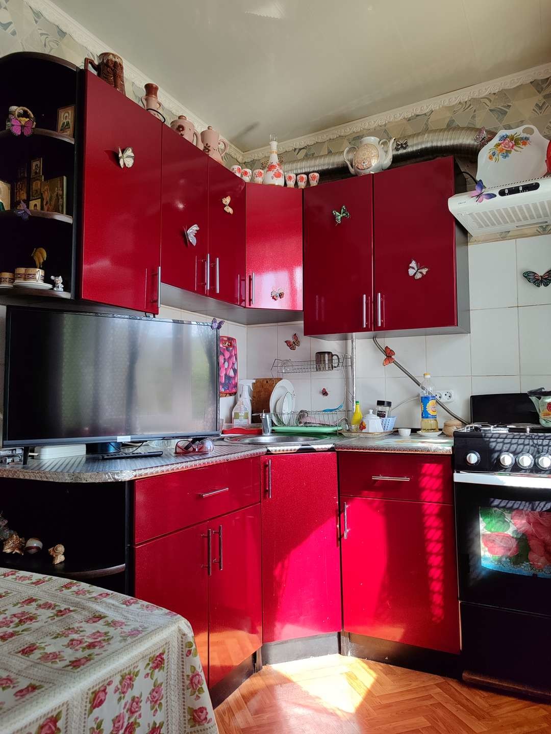 В квартире остается кухонный гарнитур с техникой (фасады кухонного гарнитура арбузного цвета, который красиво переливается на солнце), остальная мебель остается по договоренности.