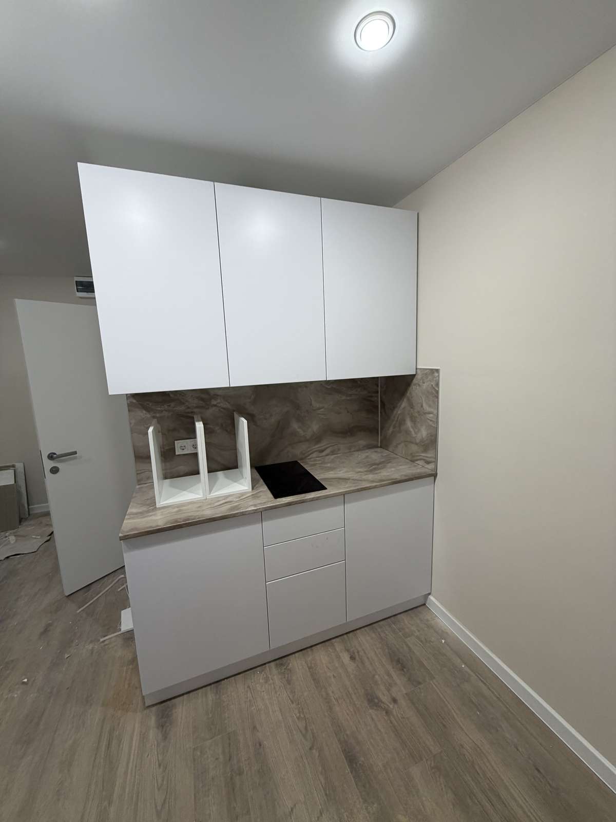 Студия будет передаваться покупателю укомплектованная кухонным гарнитуром со встроенной техникой.