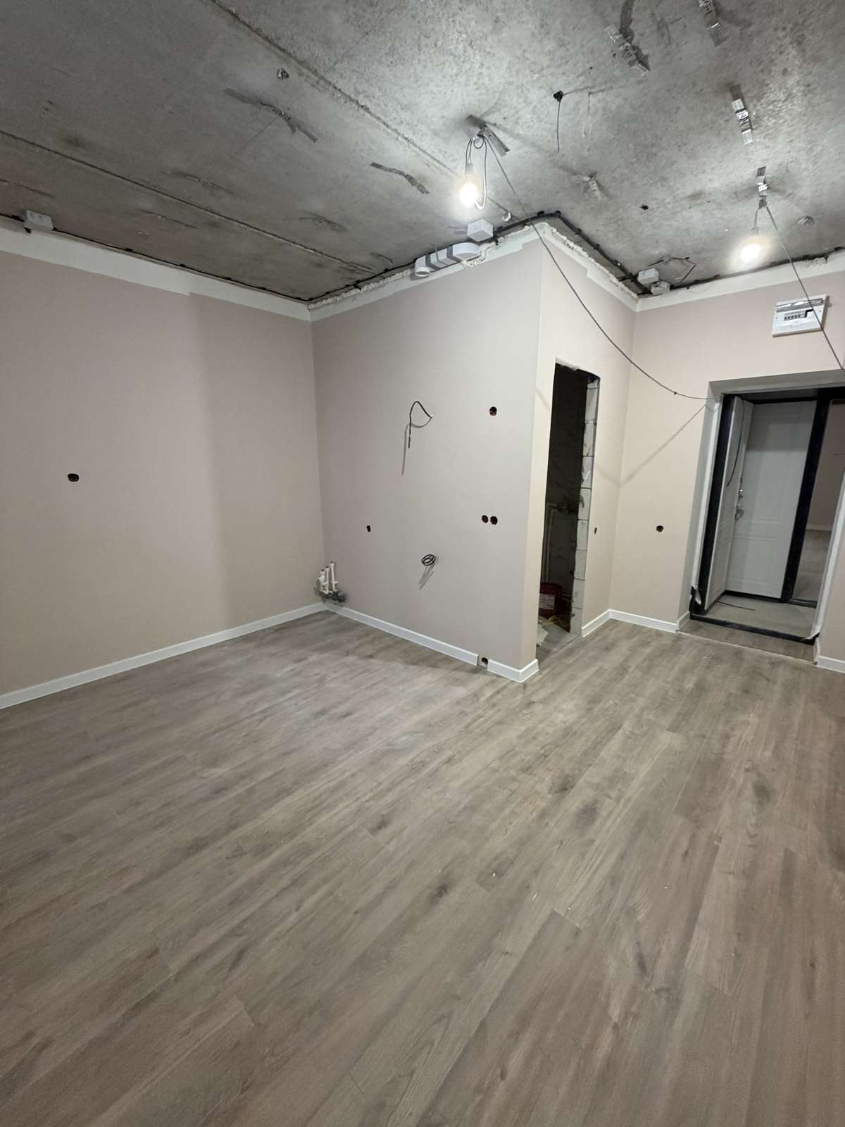 Перед началом проведения отделочных работ в помещении был проведен качественный капитальный ремонт. Стяжка пола, штукатурка стен. Полностью заменены электрика, трубы, обслужены окна. Установлены счетчики на воду горячую и холодную, электричество.