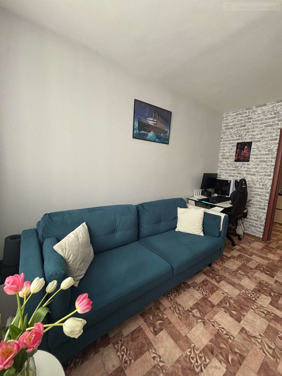 Общая площадь квартиры без учета лоджии — 35,4 кв.м., комната — 14 кв.м, кухня — 9 кв.м, раздельный санузел, лоджия остеклена. Солнечная сторона, вид не во двор — тихо и спокойно.