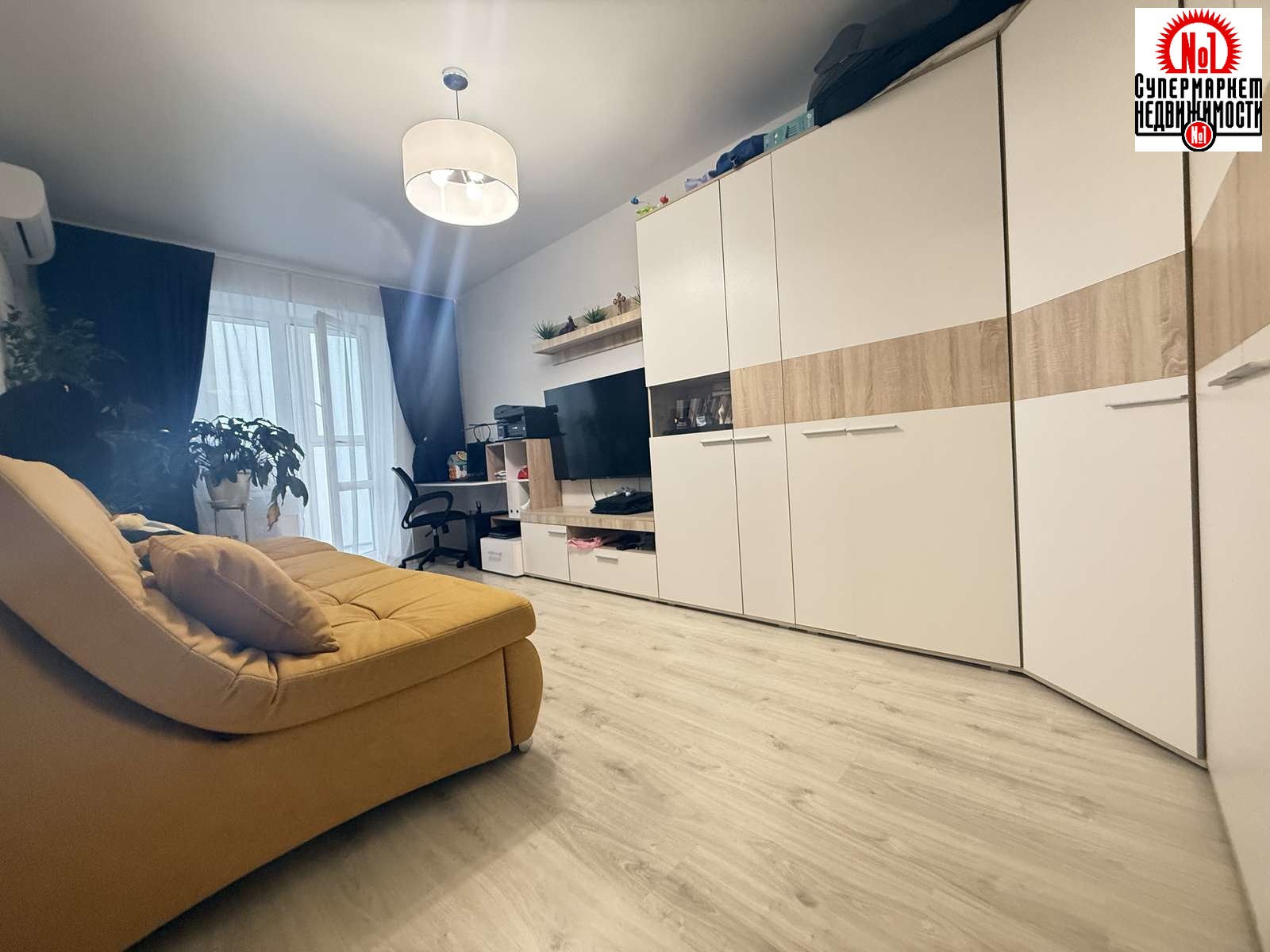 большой шкаф в комнате, компьютерный стол, кондиционер.