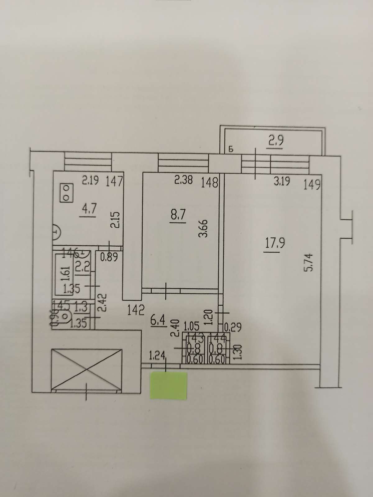 Общая площадь 43,1м. , комнаты раздельный 17,9 м.+ 8,7 м., кухня 5 м .(тех.план прилагается)