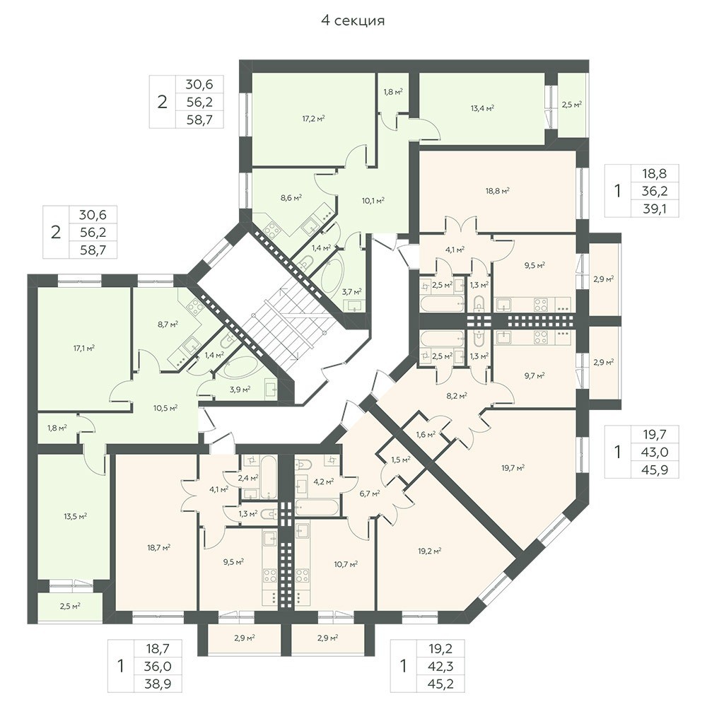 Просторные лестничные пролеты, четыре квартиры на площадке.