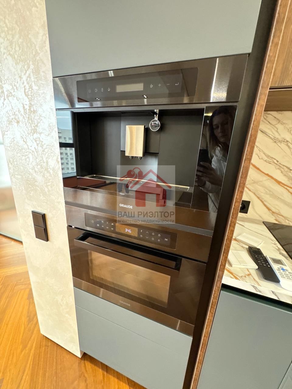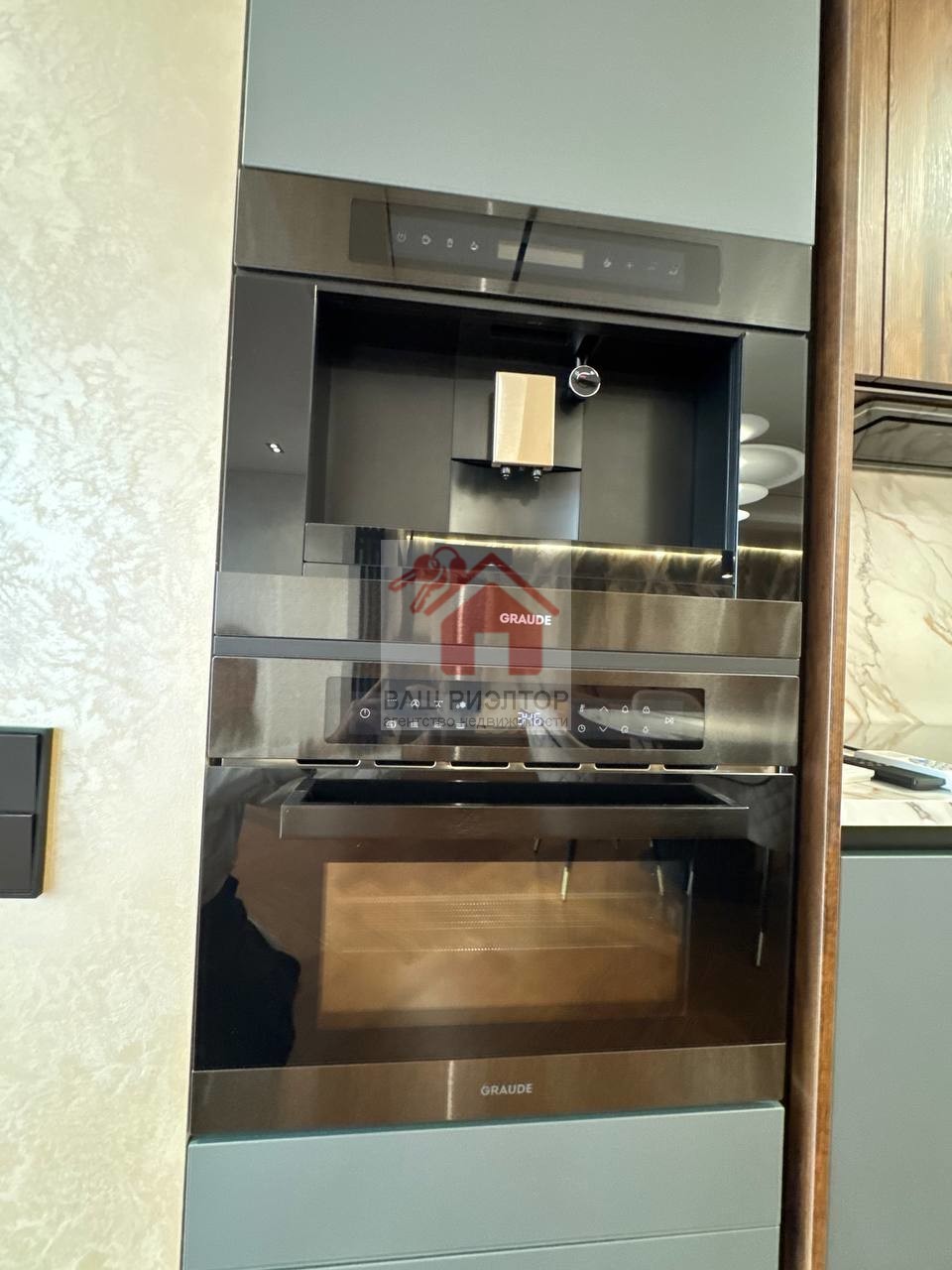 Кухню -гостиную с современным кухонным гарнитуром и фурнитурой итальянского производства, оснащенный немецкой варочной панелью KUPPERSBERG, кофемашиной и микроволновой печью GRAUDE, посудомоечной машиной ELECTROLUX, раковиной с измельчителем и фильтрацией OMOIKIRI, встроенным холодильником LIEBHERR, шикарный обеденный стол на 6 персон, удобные стулья. Обеденный и журнальный столы, а также столешница кухонного гарнитура сделаны на заказ из керамогранита CALACATTA производство Италия.