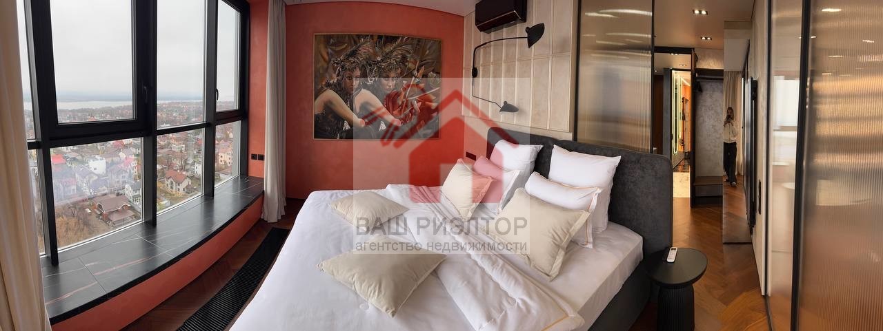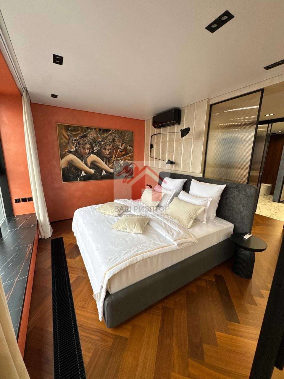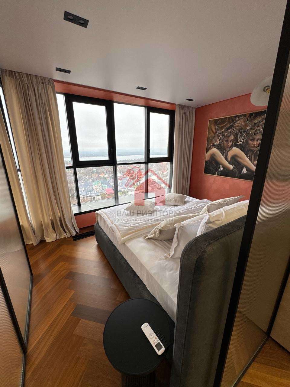 Мастер-спальня с трехпакетными панорамными окнами TTC и видами на Волгу никого не оставит равнодушным. Удобная двуспальная кровать Casaricca Италия ортопедическим матрасом и постельным бельем TOGAS, установлены датчики движения для удобства прохождения в ванную комнату и обратно. Картина, расположенная в спальне, является оригиналом известный художницы Турции.