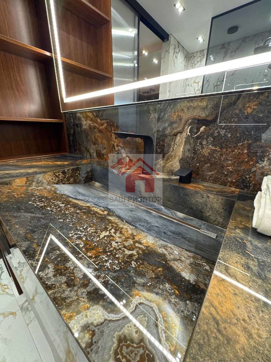 В проекте использовался только итальянский керамогранит, краски производства Бельгия, декоративная штукатурка ARTICA SIGNORIA, немецкая сантехника GROCENBERG, гигиенический унитаз с подсветкой и подогревом - автоматически смывает и омывает унитаз, в ванных комнатах установленный тёплый пол, который также подключаются к Wi-Fi системе, стиральная машинка на 7 кг плюс сушильная машинка, над ней шкаф с выдвижной системы для сушки и хранения белья, все отопительные приборы оснащены терморегуляторами. В квартире установлены приборы учёта индивидуального употребления на отопление