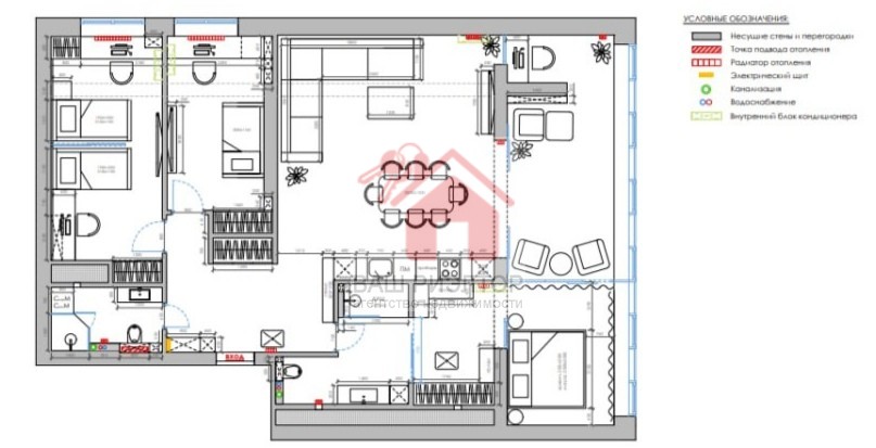 По всей квартире расположены отопительные приборы итальянского производства вертикального расположения, сплит-системы CENTEK с возможностью подключения к Wi-Fi.