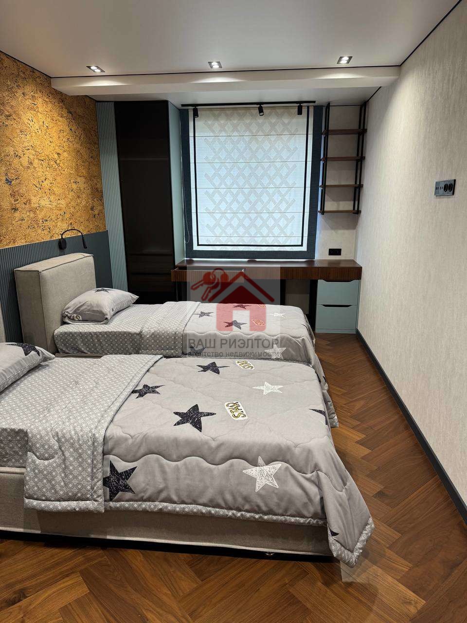 Комната для мальчиков и девочки оснащена всем необходимым - шкаф-гардероб, кровать с ортопедическим матрасом и рабочей зоны.