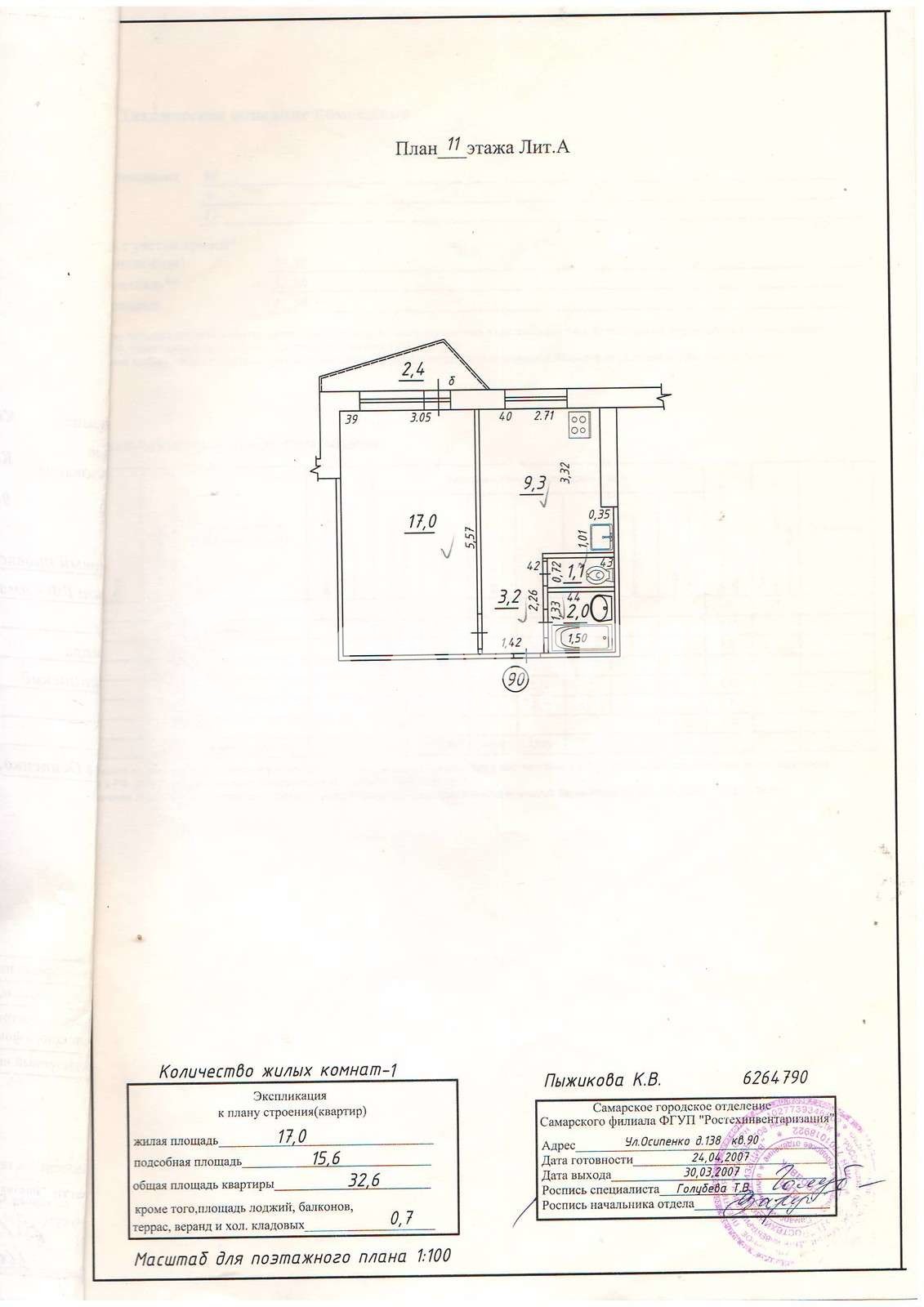 Общая площадь: 32,6 (без учета площади балкона) +2,4=35 кв.м Кухня: 9,3 кв.м Комната: 17 кв.м