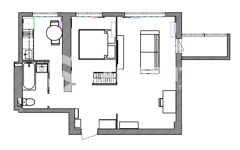 - Сделан качественный дизайнерский ремонт: залита стяжка пола, выровнены стены, новая электропроводка, окна, трубы. Сделан вывод под стиральную машину.