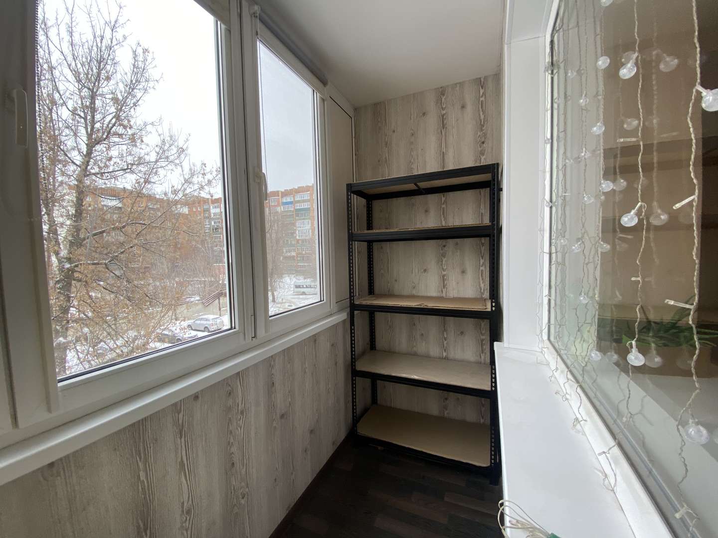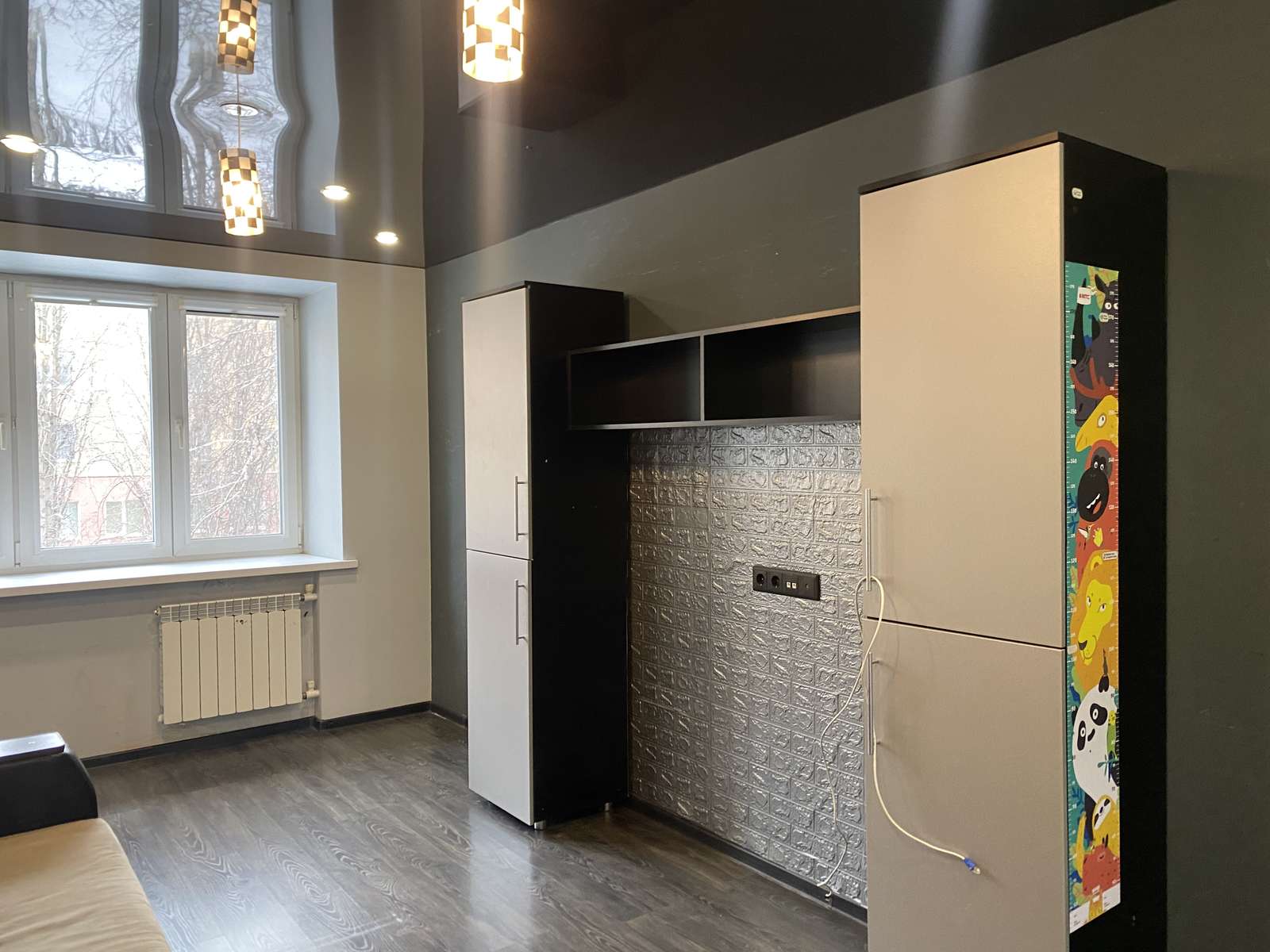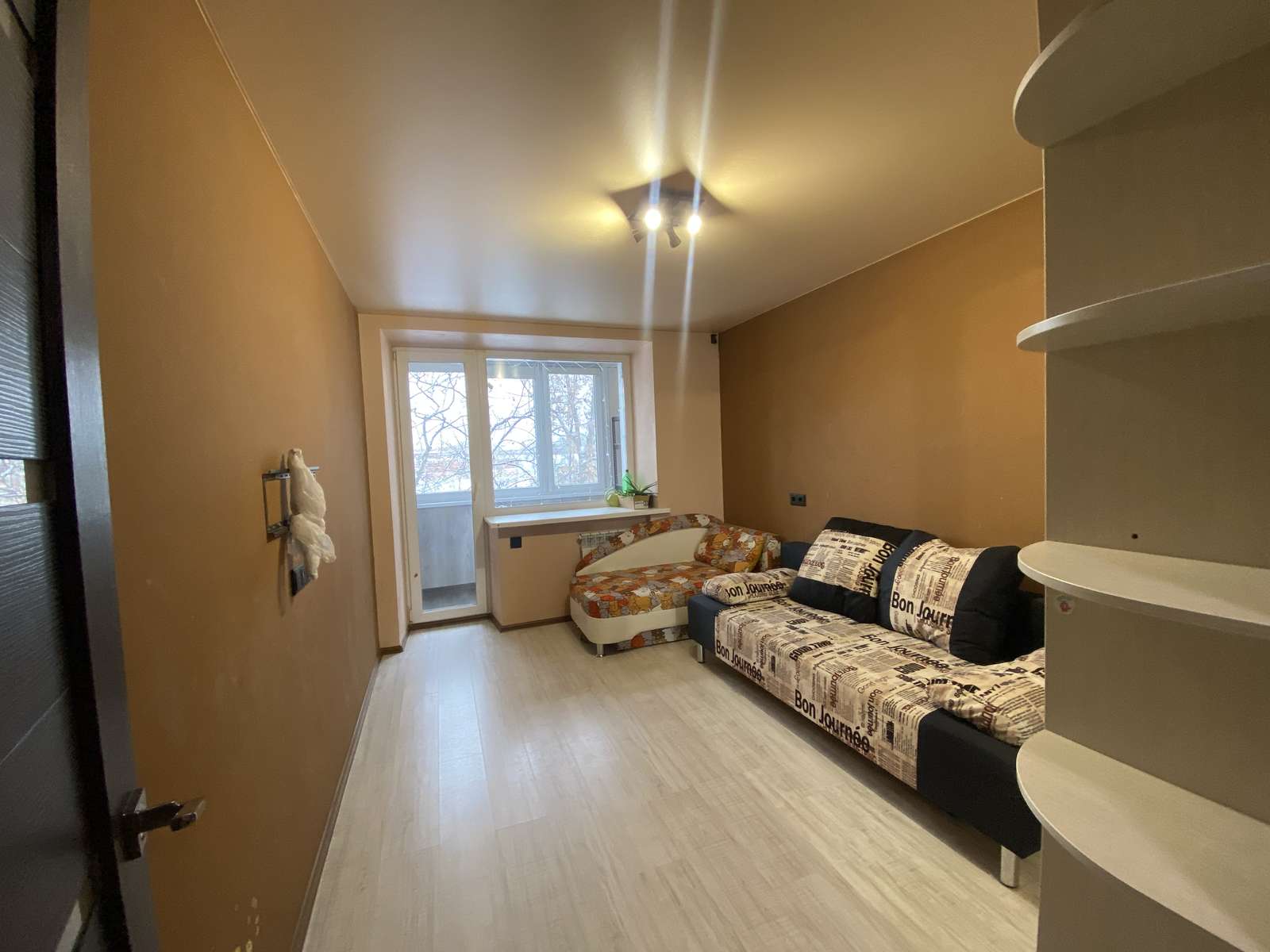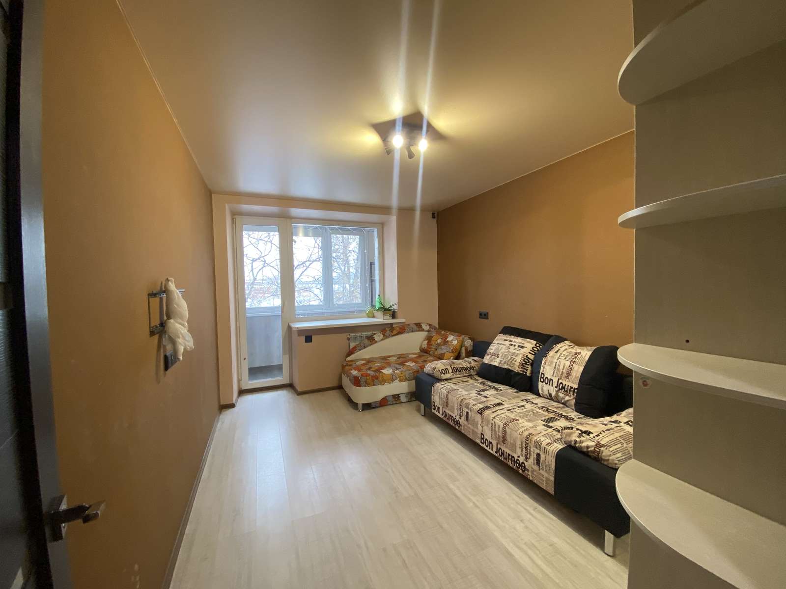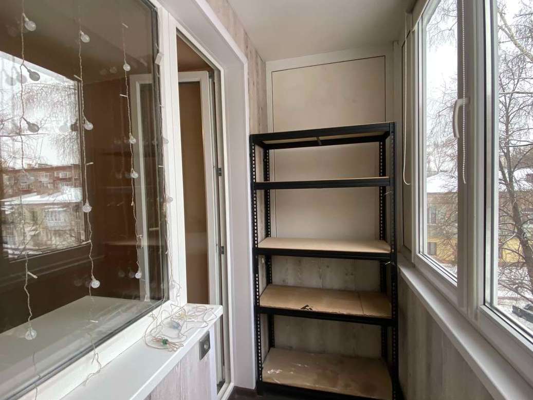 В детской комнате два дивана и вместительный шкаф-купе. Из комнаты выход на балкон. Балкон с остеклением, отделан и оборудован стеллажами.