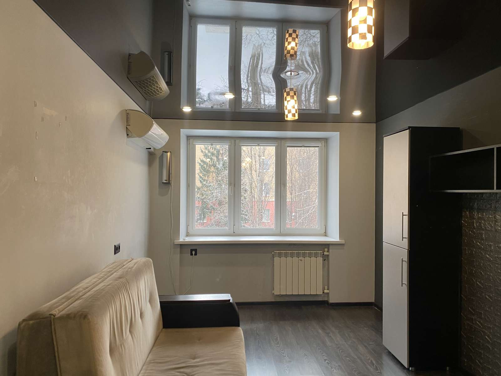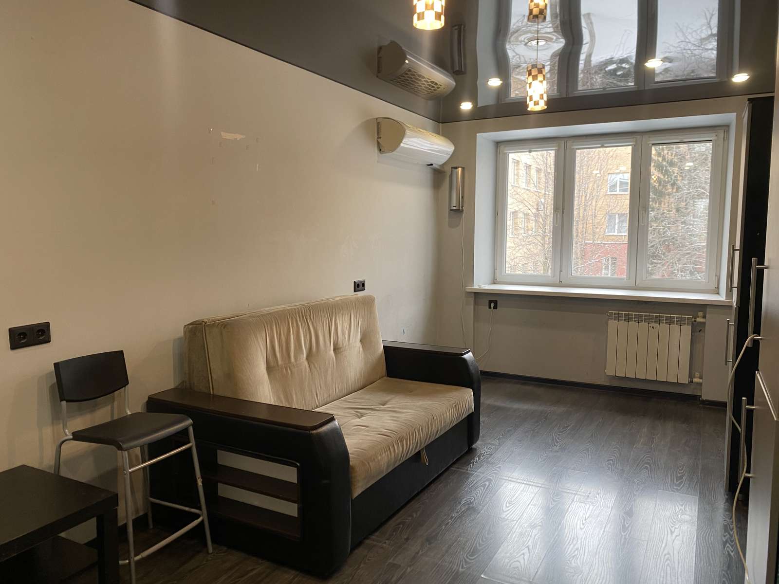В большой комнате раскладывающийся диван, стенка-горка и для комфорта летом-кондиционер.