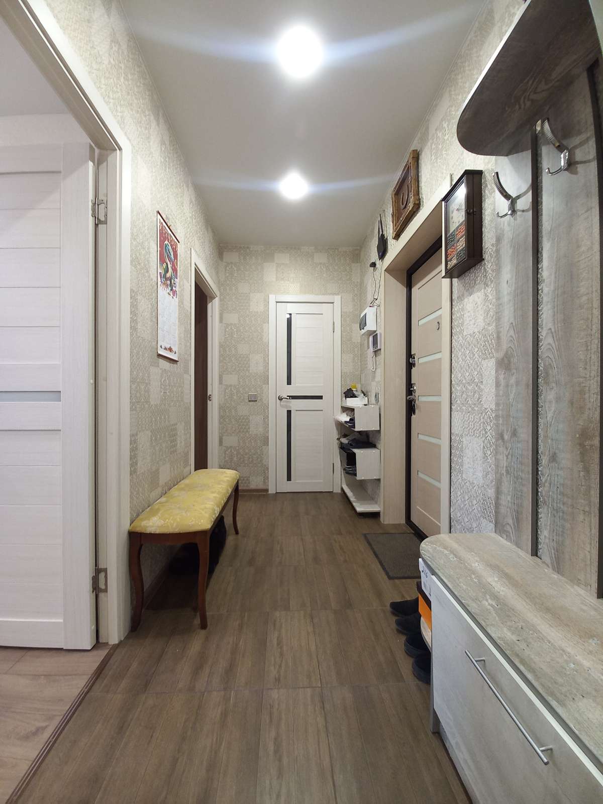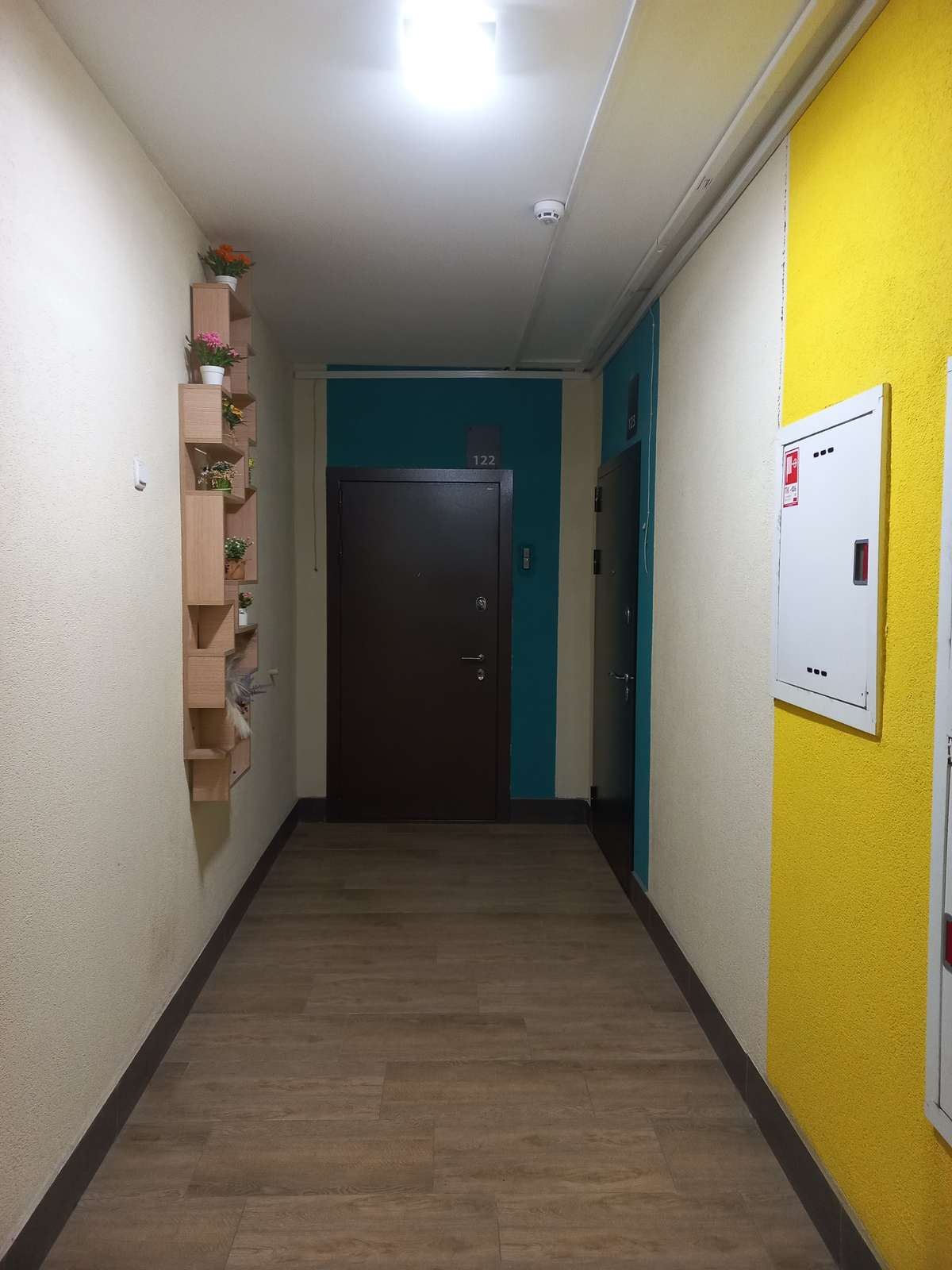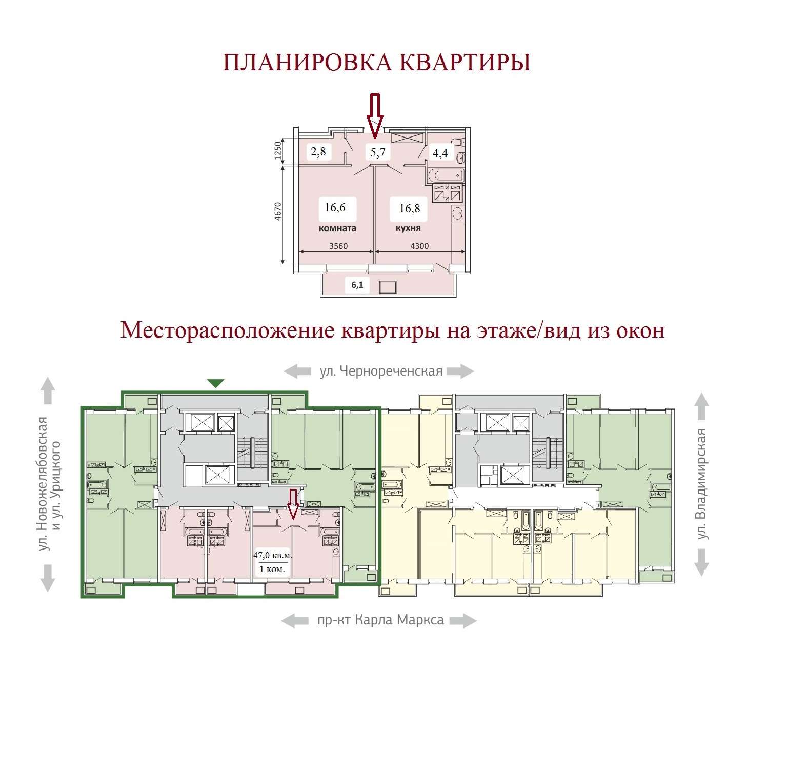 Общая площадь – 47,0 кв.м. (по выписке ЕГРН), кухня – 16,8 кв.м. (правильной формы), комната – 16,6 кв.м., отдельная гардеробная – 2,8 кв.м., функциональный коридор – 5,7 кв.м., застекленный балкон – 6,1 кв.м. с выходом из кухни (что очень удобно в пользовании!). Окна выходят на пр-кт Карла Маркса (восточная сторона).