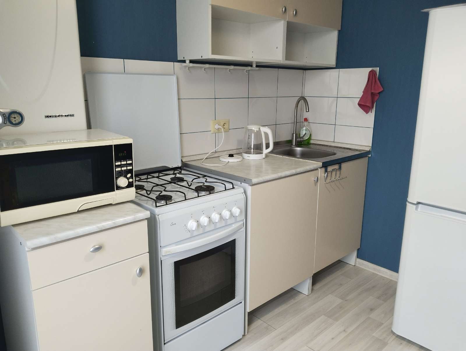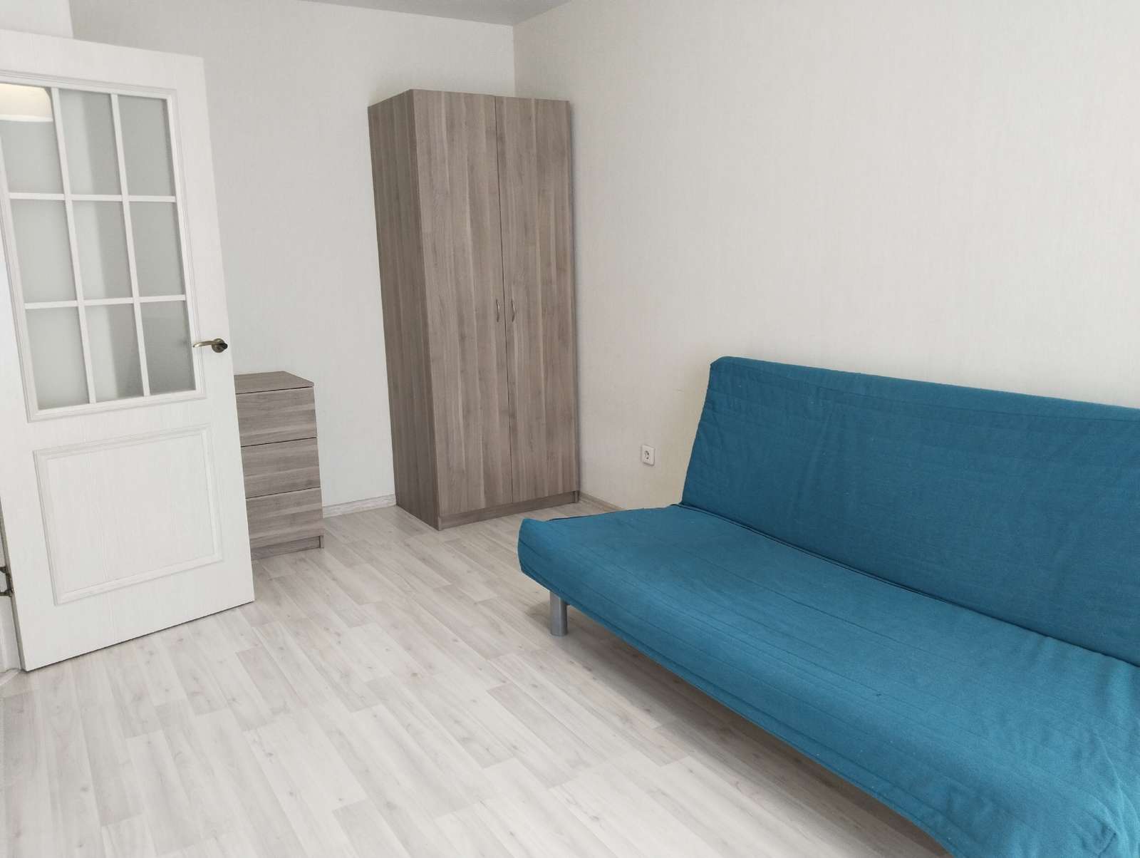 В квартире есть всё необходимое для комфортного проживания: диван, шкаф, комод, кухонный гарнитур, холодильник, стиральная машинка.