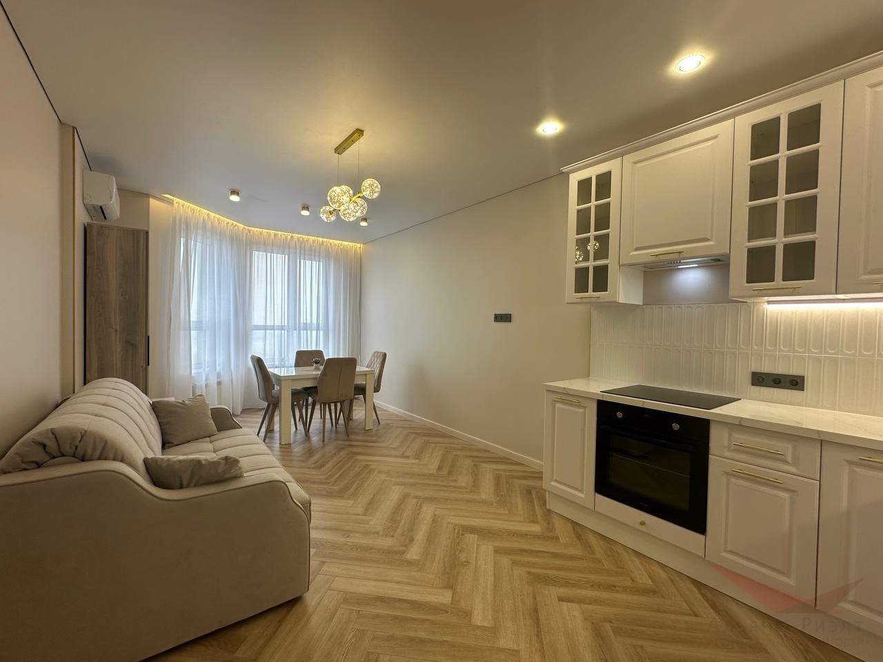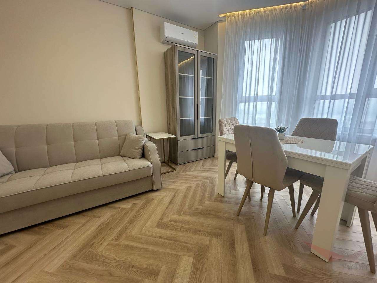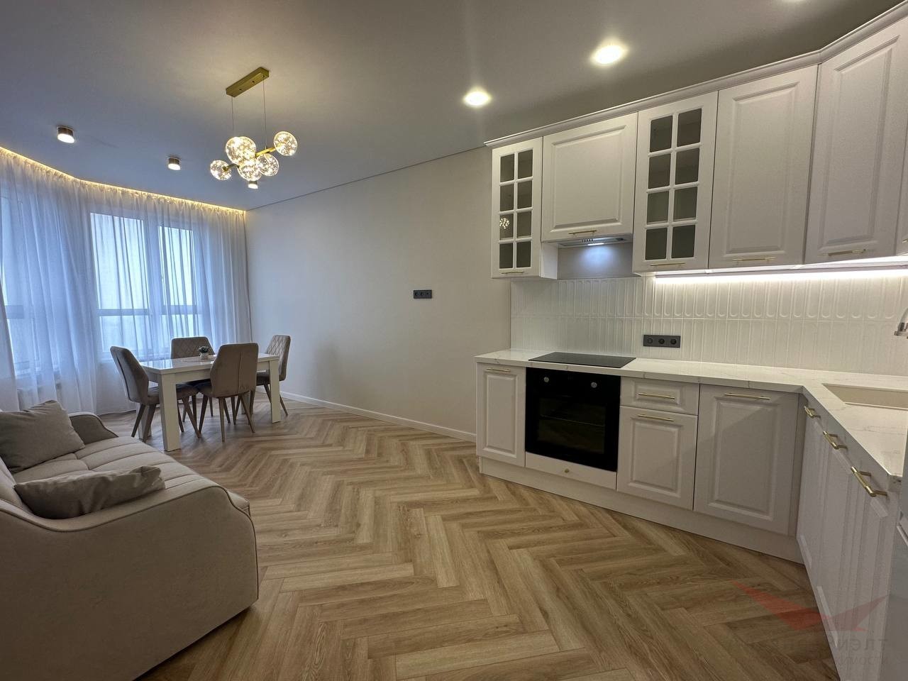 Дизайнеский евроремонт. Идеально выравняные и покрашенные стены по современной технологии. Качественный дорогой ламинат-паркет, отапливаемая лоджия — зимний сад. Кухня-гостиная представляет гостиную зону 13м и кухню 10м, кухонный гарнитур со встроенной техникой — духовой шкаф, варочная панель, вытяжка, посудомоечная машина. Установлен фильтр с питьевой водой.