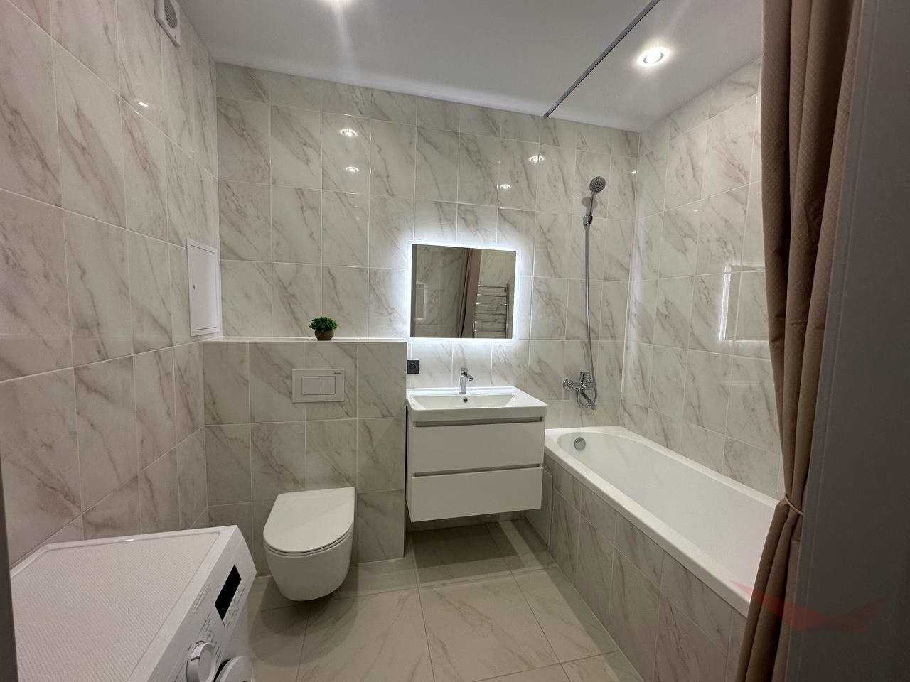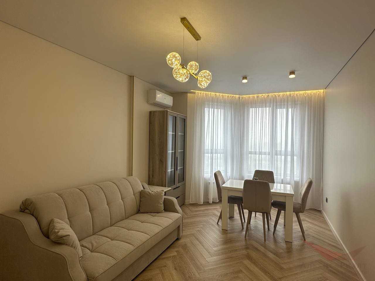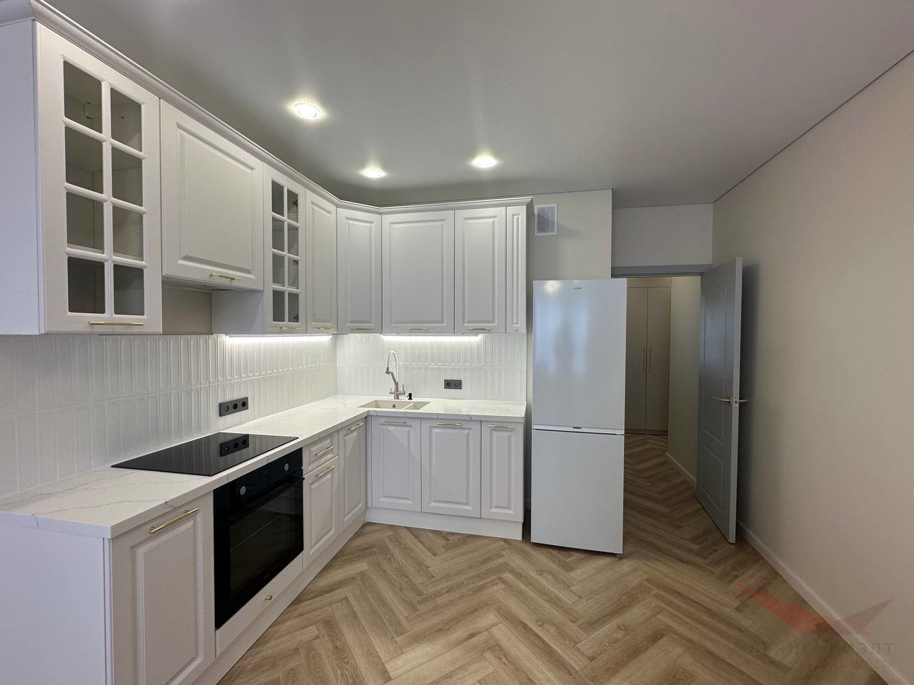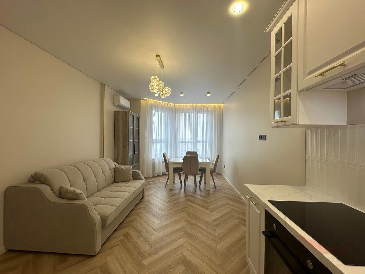 Дизайнеский евроремонт. Идеально выравняные и покрашенные стены по современной технологии. Качественный дорогой ламинат-паркет, отапливаемая лоджия — зимний сад. Кухня-гостиная представляет гостиную зону 13м и кухню 10м, кухонный гарнитур со встроенной техникой — духовой шкаф, варочная панель, вытяжка, посудомоечная машина. Установлен фильтр с питьевой водой.