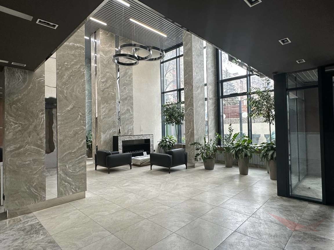 Уникальное пространство начинается с самого входа — ресепшен с видеонаблюдением, просторное лобби, мягкая зона с камином, колясочная.