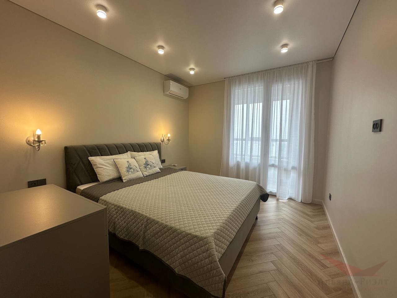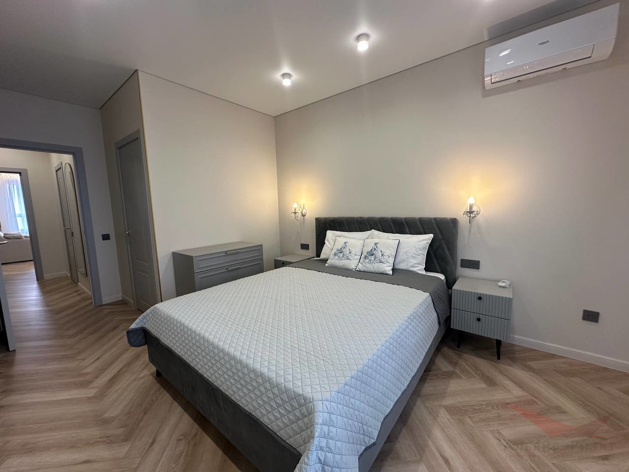 В спальне есть своя гардеробная, двуспальная кровать, кондиционер.